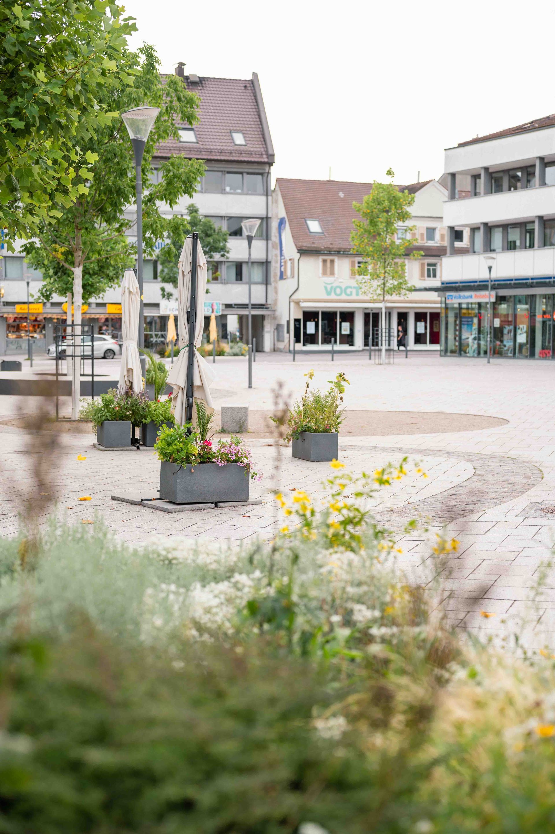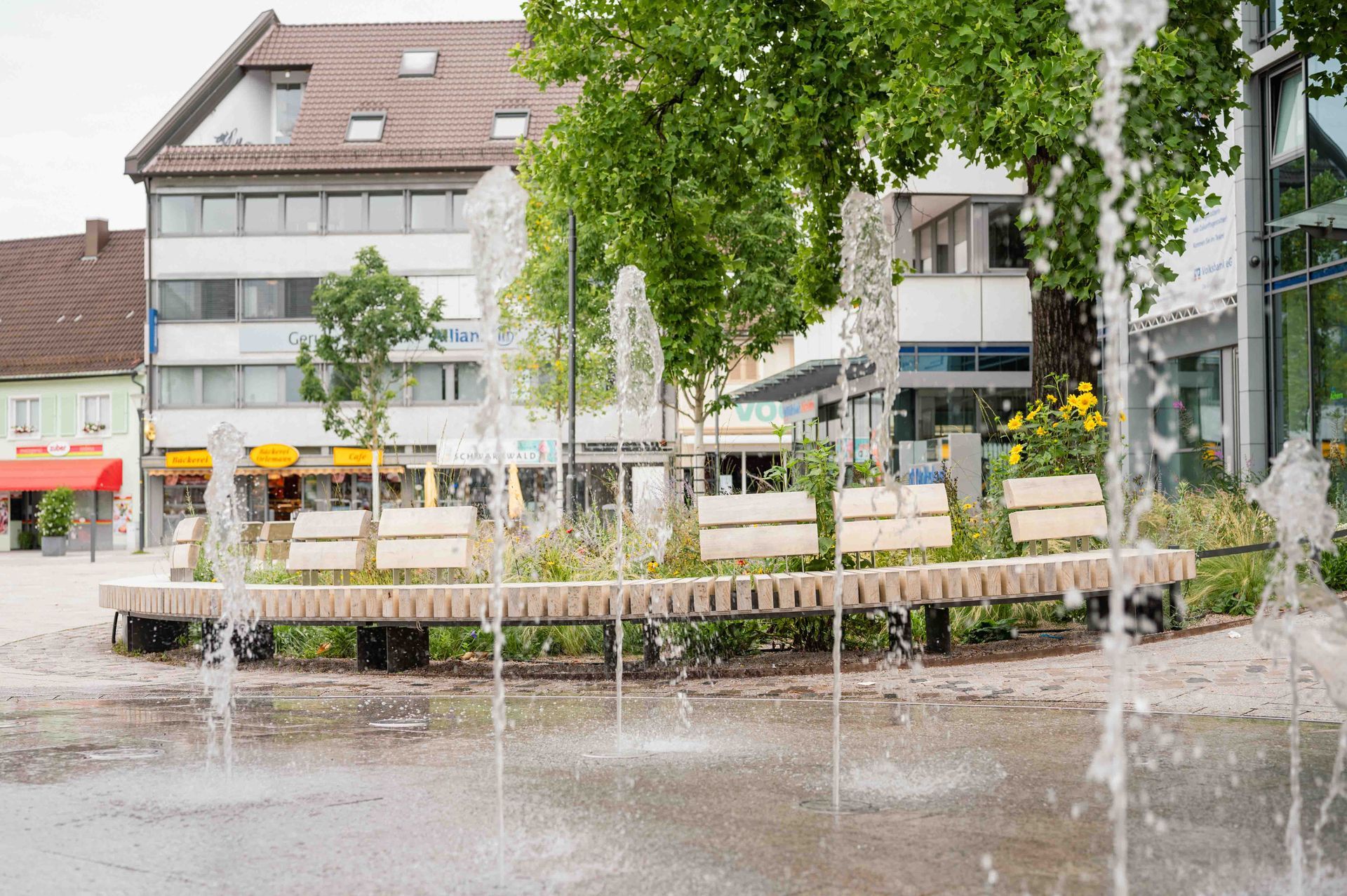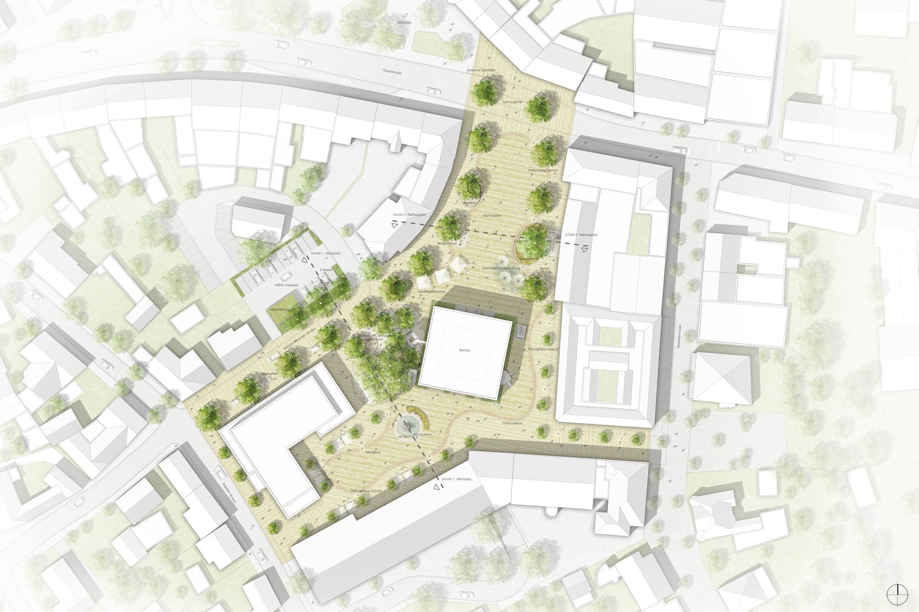 Die Platzmitte bleibt ähnlich dem Rathausplatz flexibel, nutzungsoffen für Märkte, Veranstaltungen und Events. Zufahrten wurden integriert und ein Parkplatz neugebaut. Pflasterplatten aus Dolomit bilden den neuen einheitlichen Stadtboden, der sich schwellenlos über die gesamten Platz- und Straßenflächen ausbreitet. Gegliedert wird der Platz durch ein im Boden eingelegtes Pflasterband, welches die verschiedenen Platzräume gestalterisch verbindet und den Besucher dabei führt und lenkt. Ein im Belag integriertes Düsenfeld vor dem Rathaus belebt den Platz im Sommer und schafft eine angenehme Atmosphäre.