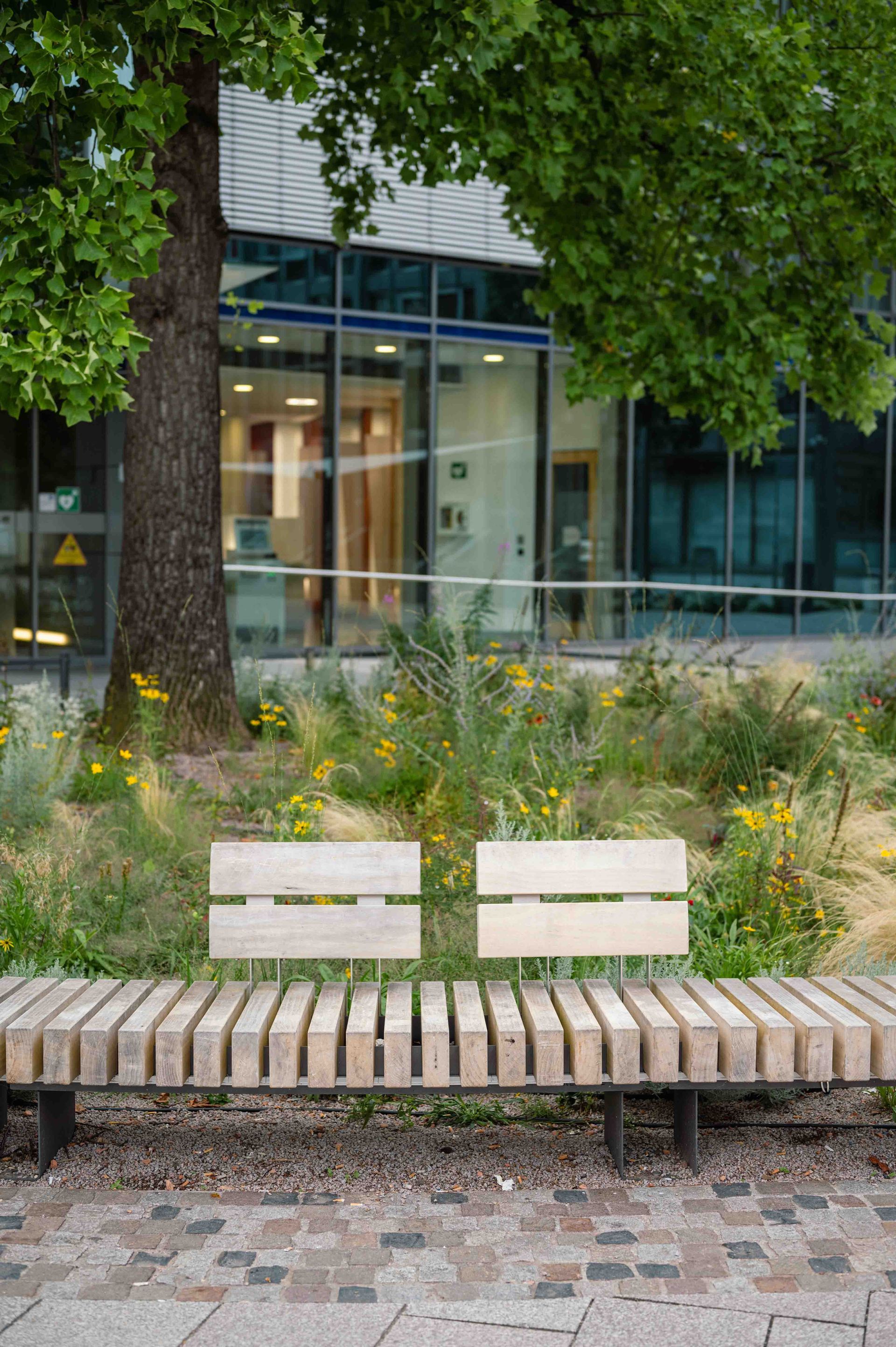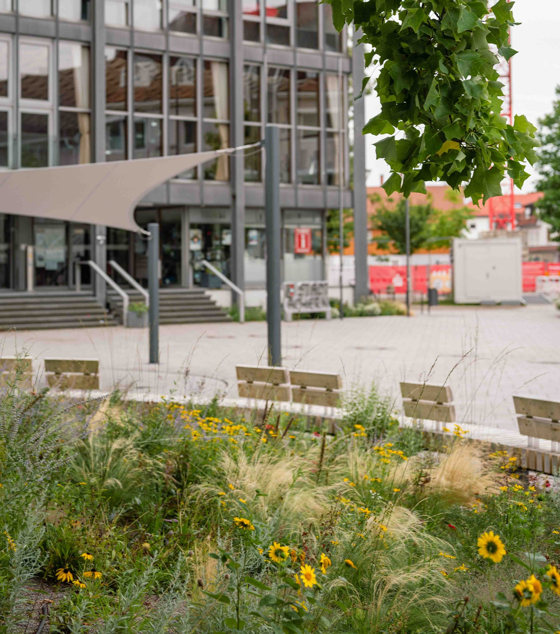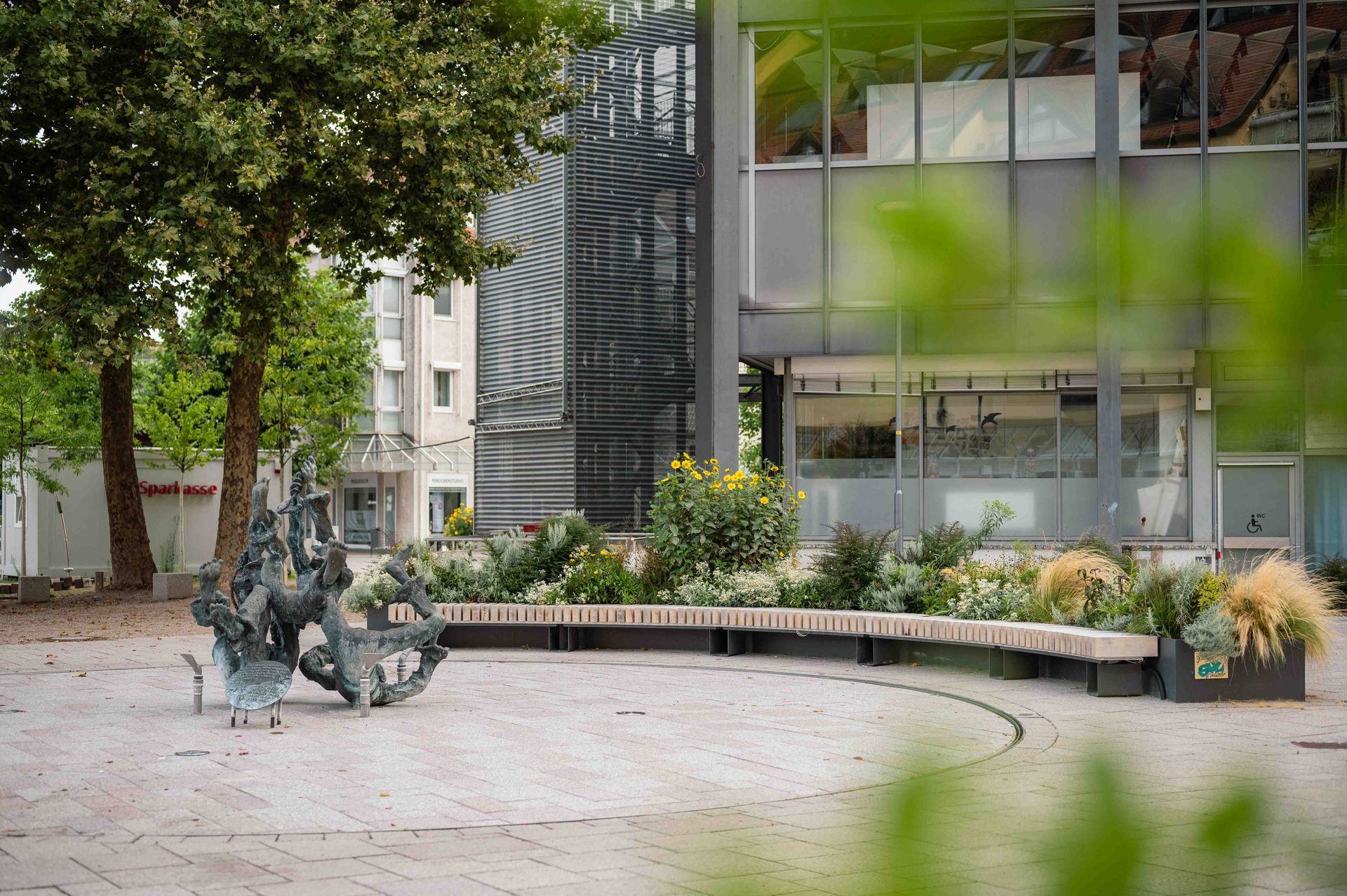 Die Platzmitte bleibt ähnlich dem Rathausplatz flexibel, nutzungsoffen für Märkte, Veranstaltungen und Events. Zufahrten wurden integriert und ein Parkplatz neugebaut. Pflasterplatten aus Dolomit bilden den neuen einheitlichen Stadtboden, der sich schwellenlos über die gesamten Platz- und Straßenflächen ausbreitet. Gegliedert wird der Platz durch ein im Boden eingelegtes Pflasterband, welches die verschiedenen Platzräume gestalterisch verbindet und den Besucher dabei führt und lenkt. Ein im Belag integriertes Düsenfeld vor dem Rathaus belebt den Platz im Sommer und schafft eine angenehme Atmosphäre.