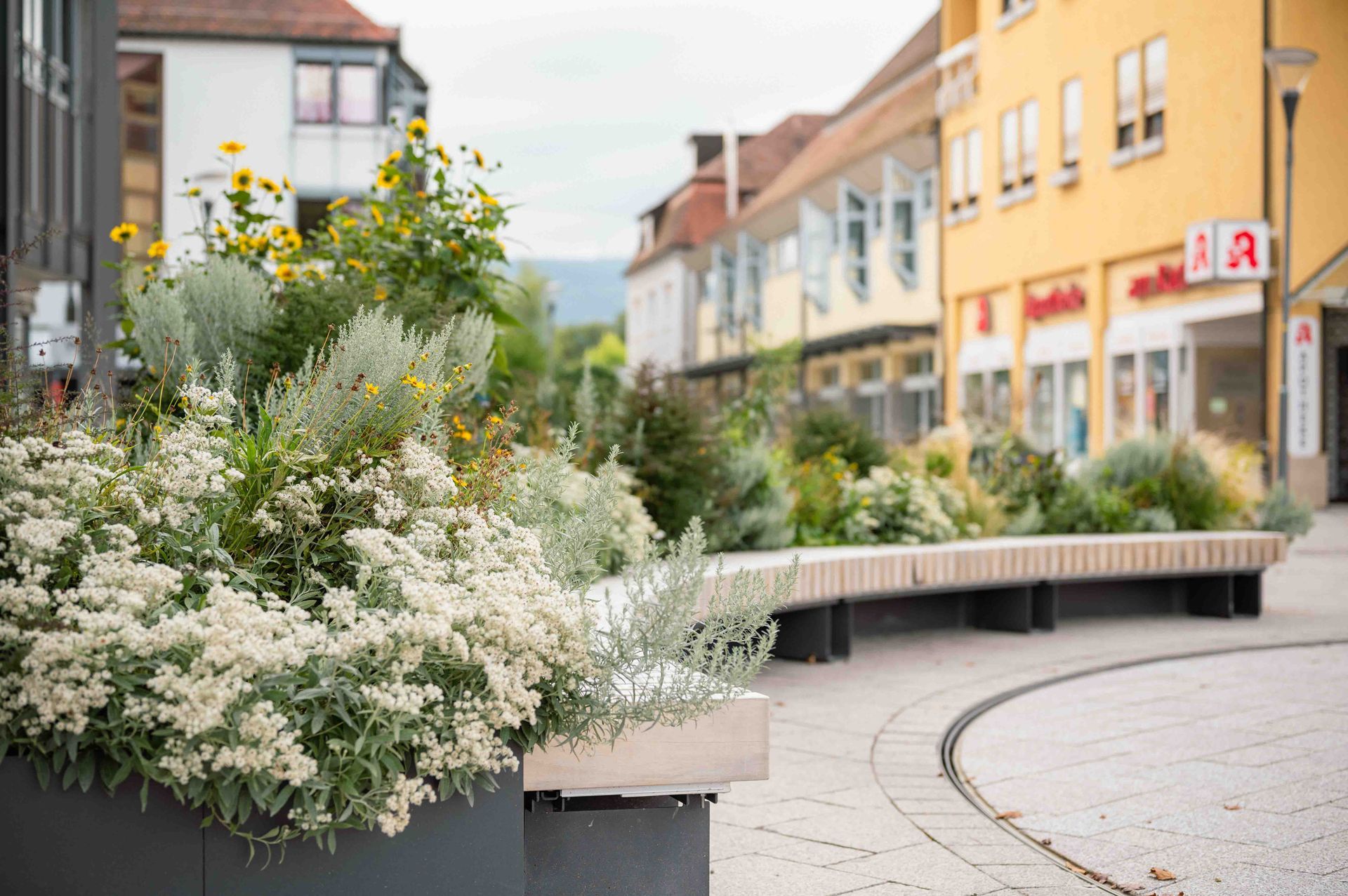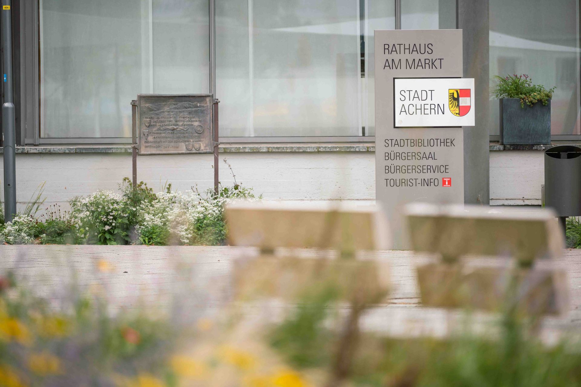 In der Stadtmitte von Achern wurde aus mehreren sehr unterschiedlich geprägten Platz- und Straßenräumen eine neue Mitte mit fließenden Übergangen gestaltet. Der Rathausplatz wurde durch die Pflanzung großkroniger Bäume in seiner Kontur gestärkt und erhielt großzügige Aufenthalts- und Sitzbereiche. Die Baumpflanzungen wurden dabei über die Hauptstraße geführt und fanden so Anschluss an den grünen Adlerplatz.