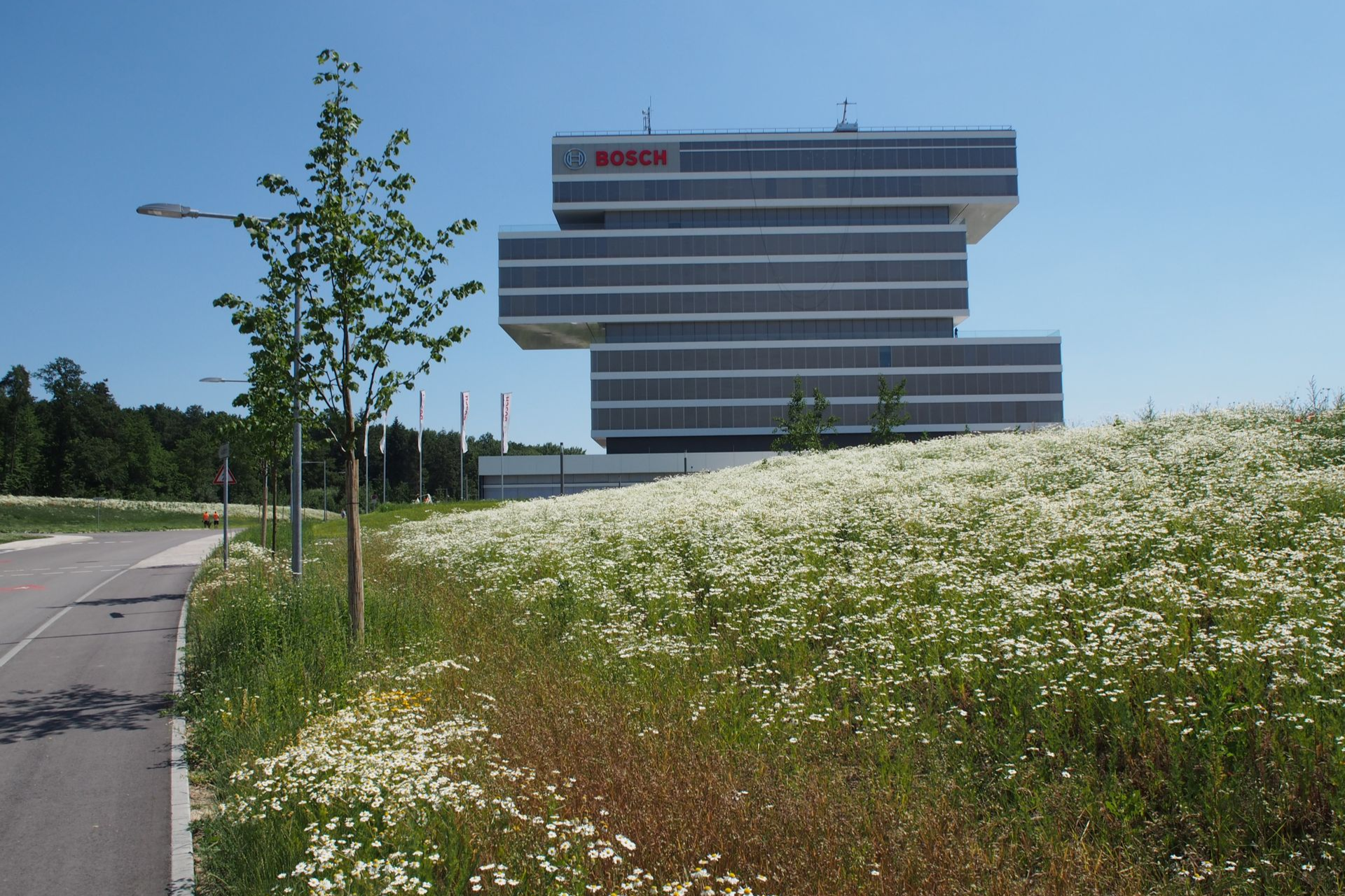 In Renningen steht seit 2014 das Forschungs- und Entwicklungszentrum der Robert Bosch GmbH. Auf dem Gelände der Standortneugründung werden auch im Freiraum neue Maßstäbe gesetzt. Baukörper und Freiflächen fügen sich harmonisch in die Landschaft des Heckengäus. Funktionale Erfordernisse im Außenraum befinden sich im Einklang mit einer ansprechenden Gestaltung von Erholungsräumen für die Mitarbeiter. Neben der Konzeption von Zufahrtsstraßen, Parkplätzen, Fuß- und Radwegverbindungen ist die Schaffung eines großzügigen Campusbereiches gelungen, der die Gebäude umschließt, vernetzt und vielfältige Grünräume ermöglicht. Regenwasserversickerung und eine Kläranlage ermöglichen ein innovatives Wassermanagement direkt am Ort.
