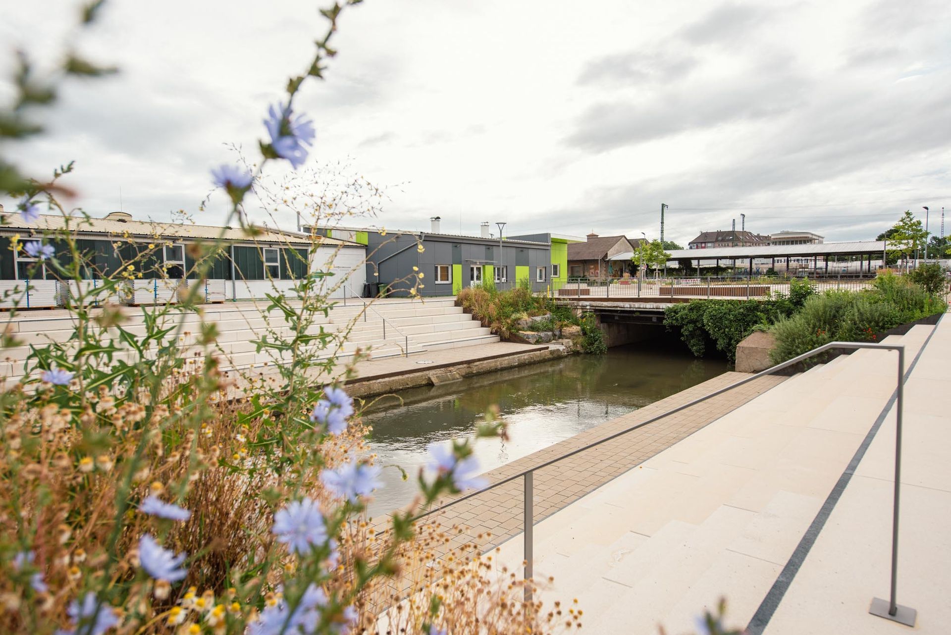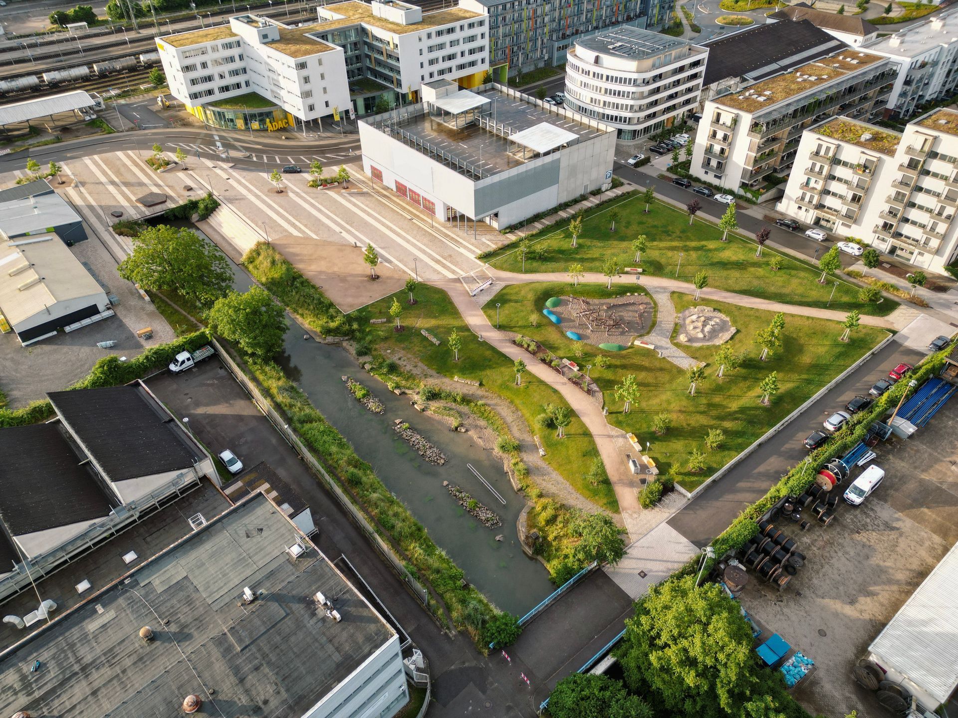 Die Freiflächen im Zentrum des neuen Stadtquartiers bieten hervorragende Möglichkeiten, um Attraktivität für alle Generationen zu schaffen. Vom urbanen Platz am Saalbach für Freilichtveranstaltungen über Sitz- und Aufenthaltsflächen am Bach und unter Bäumen, Spiel- und Grünflächen, einem gut strukturierten Wegenetz bis hin zu einem kleinen Außencafé ist in der Bahnstadt Bruchsal ein lebendiges Miteinander entstanden.