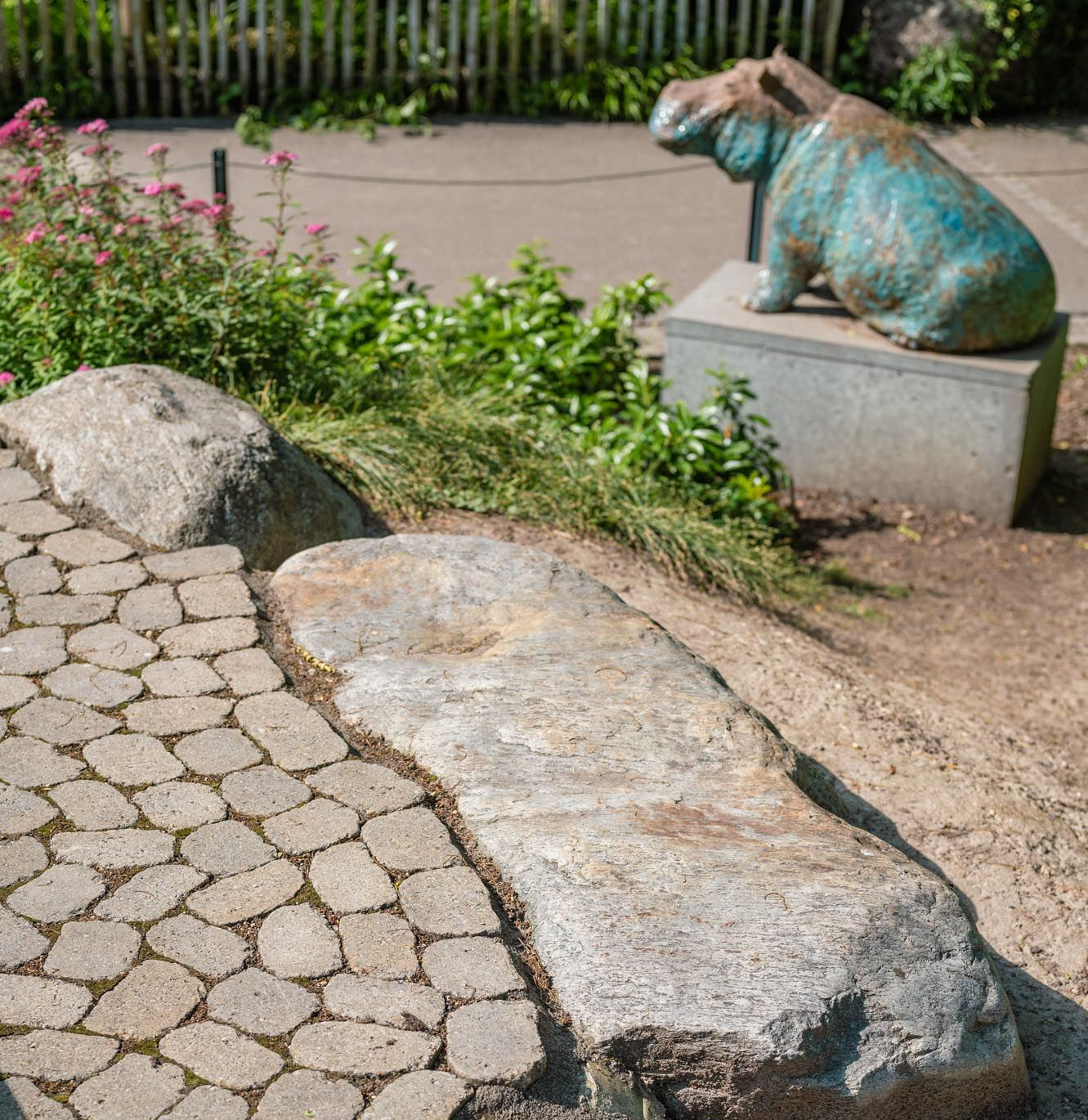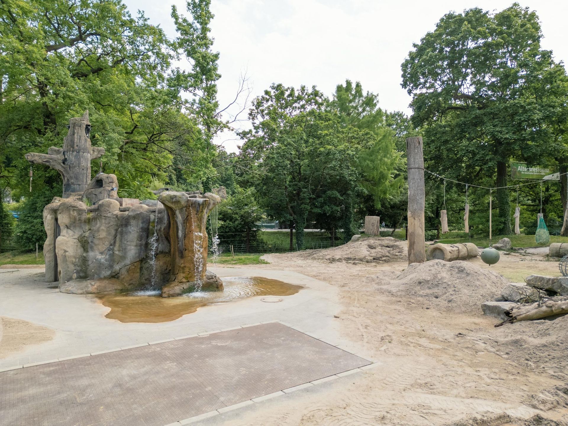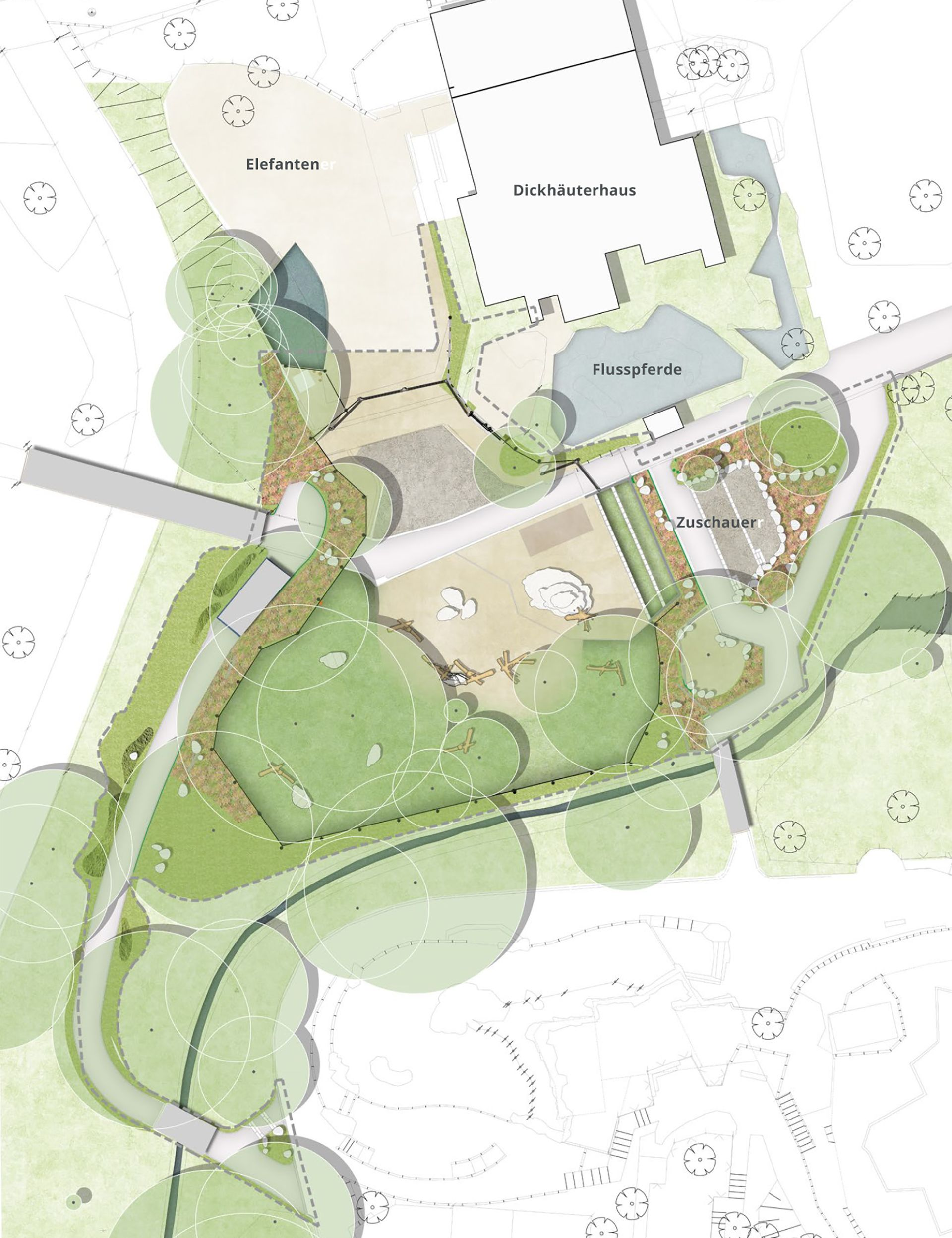 Erforderliche Sicherheitsabstände zwischen den Besucherbereichen und dem Tiergehege werden mit Staudenpflanzungen abwechslungsreich gerahmt, ebenso wie die über drei Stufen im Gelände ansteigenden Terrassen aus Natursteinblöcken im Osten. Von hier aus haben die Besucher einen ungestörten Blick über den Trockengraben hinweg auf die Elefanten und können die Tiere bei den Aktivitäten am Futterbaum und unter dem Wasserfall beobachten.