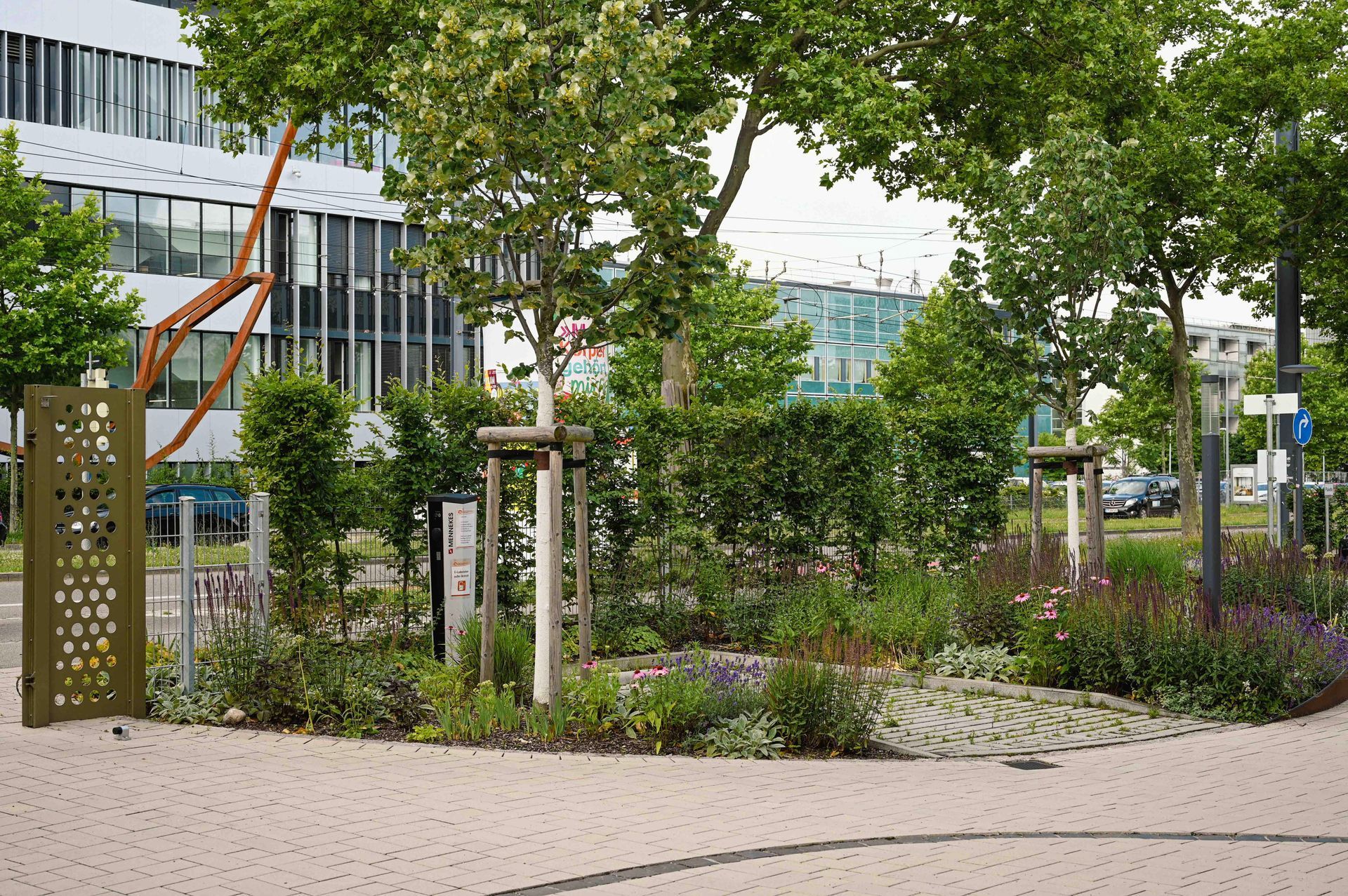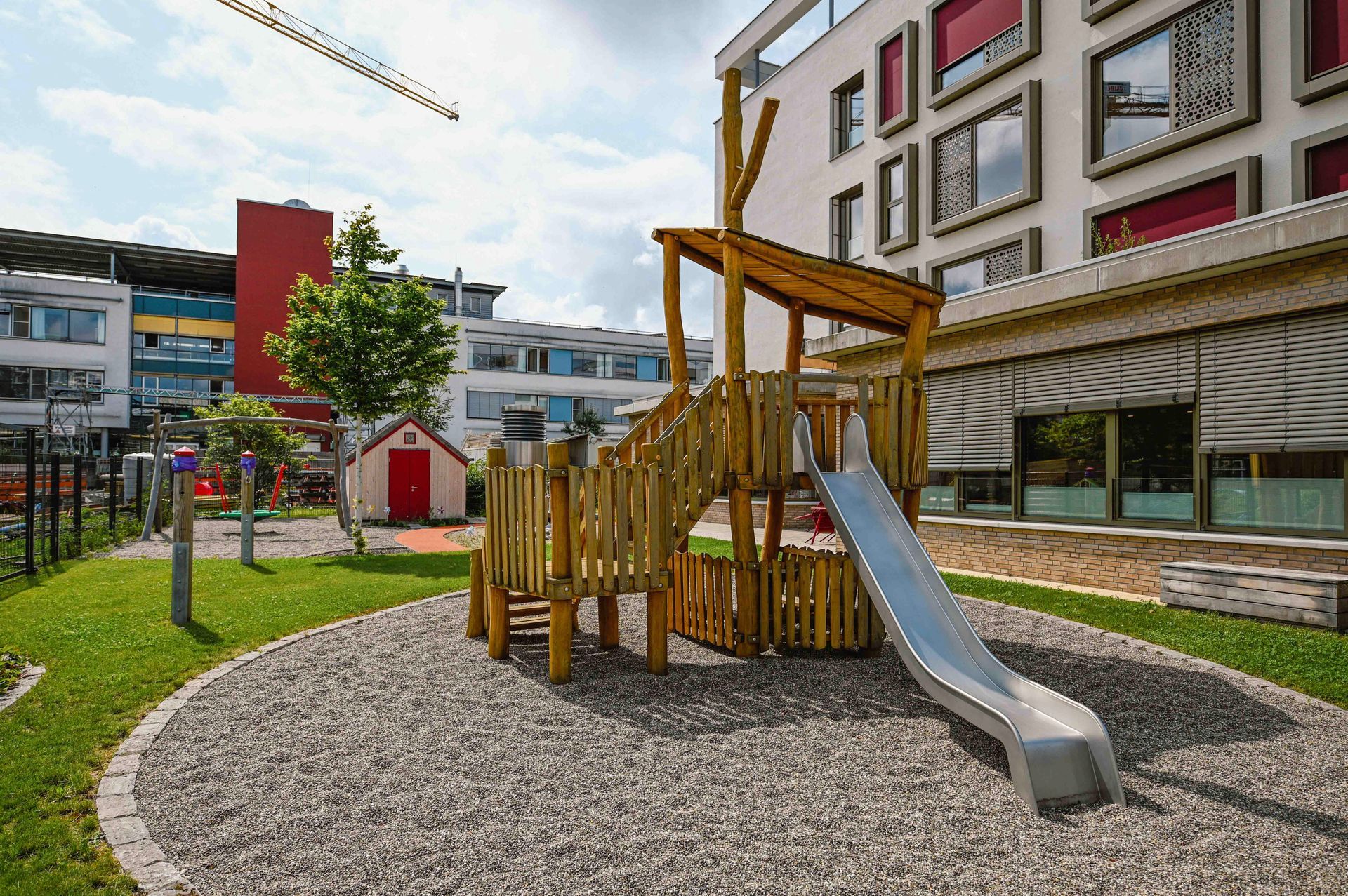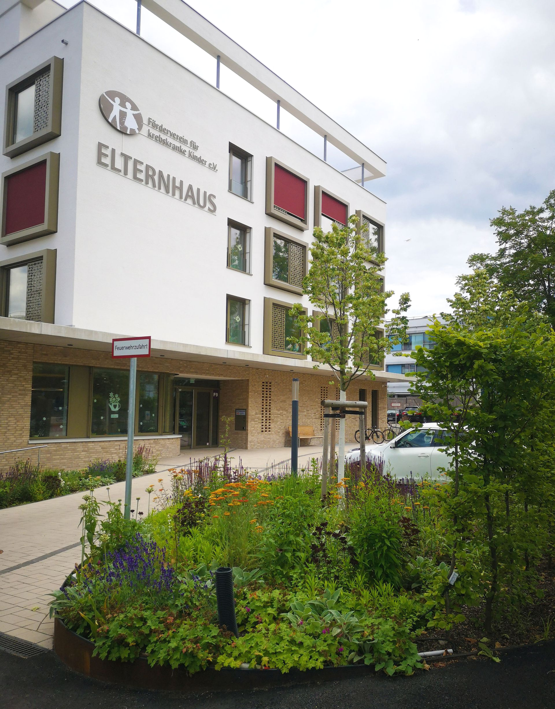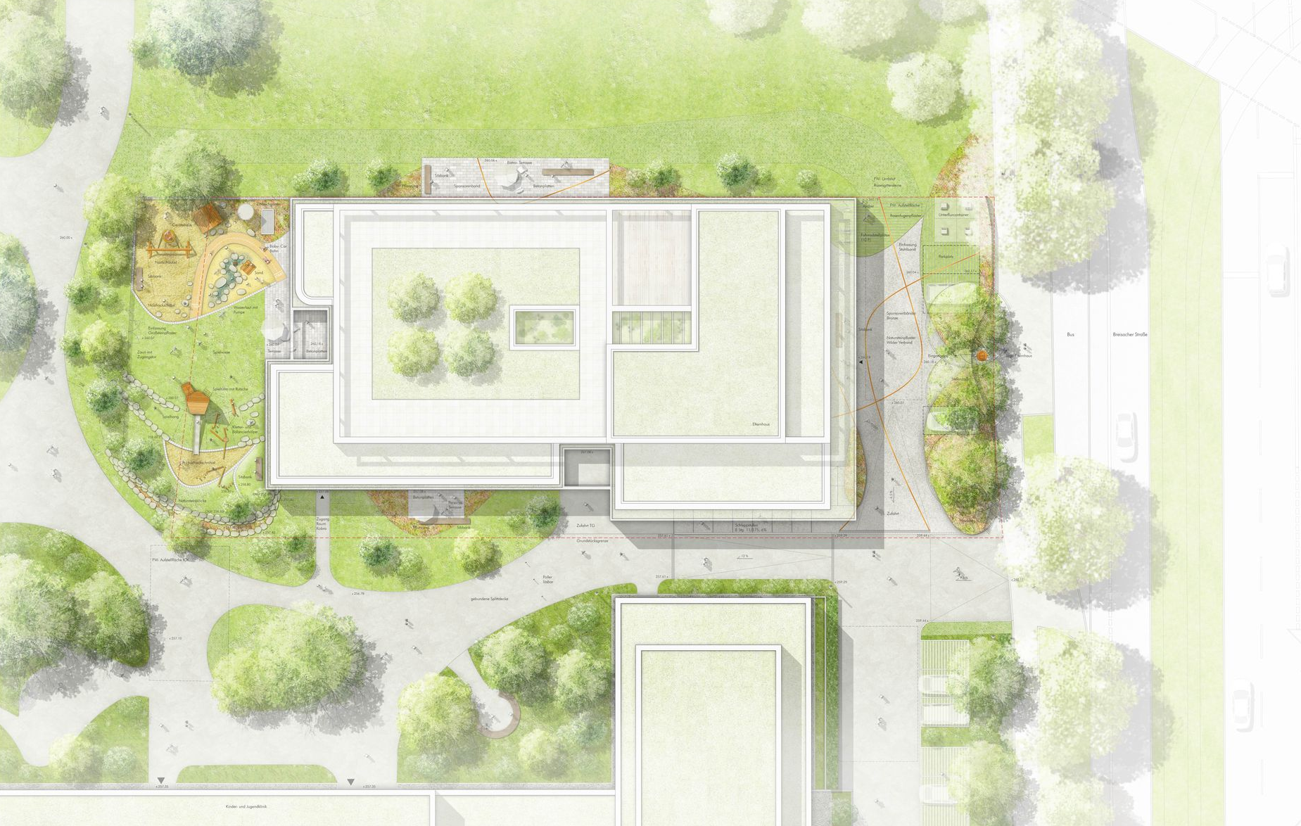 Der Entwurf nutzt den Bogen als prägendes Gestaltungselement, das sich harmonisch in die geschwungenen Formen des Klinikparks einfügt. Auf dem Vorplatz gliedern Bögen die Belagsflächen und schaffen einen spannungsvollen Kontrast zur Architektur. Besonders Pflanzflächen sorgen für Abgrenzung, während Parken und Müllentsorgung unauffällig integriert sind. Der zweigeschossige Spielbereich bietet mit Wasserlauf, Sandfläche, Kletterstrukturen und einer Bobby-Car-Bahn vielseitige Spielmöglichkeiten. Personal- und Bistro-Terrassen sind schlicht gestaltet, mit Betonplatten belegt und von Stauden eingefasst. Sämtliche Regenwassermengen werden in einer unterirdischen Versickerungsanlage zusammengeführt und dem Grundwasserkörper wieder zugeführt. Ein Pflasterband versinnbildet den Kreis der Sponsoren und ergänzt die Gestaltung. Der Entwurf verbindet Funktionalität mit einer harmonischen, landschaftsbezogenen Ästhetik.