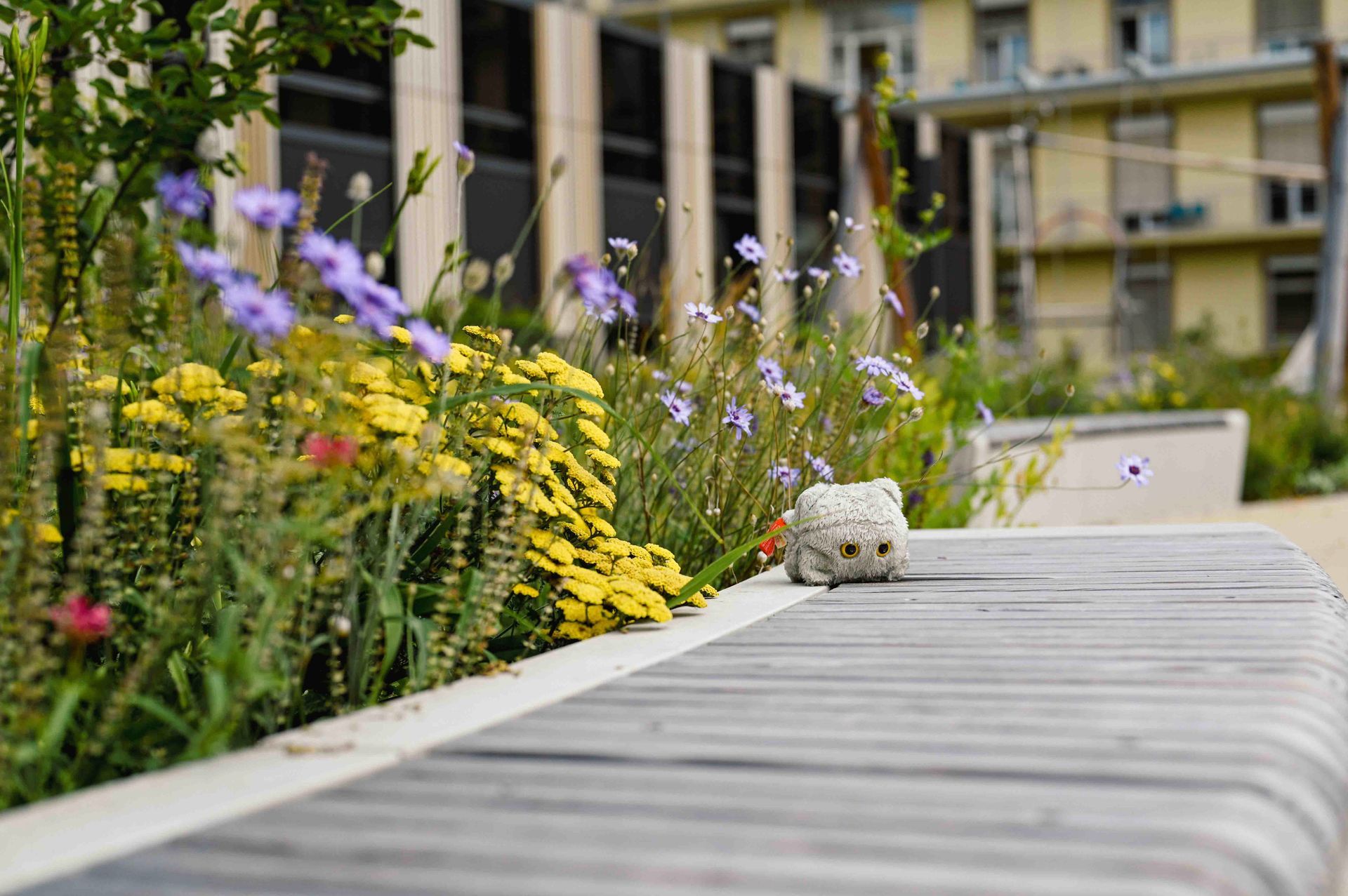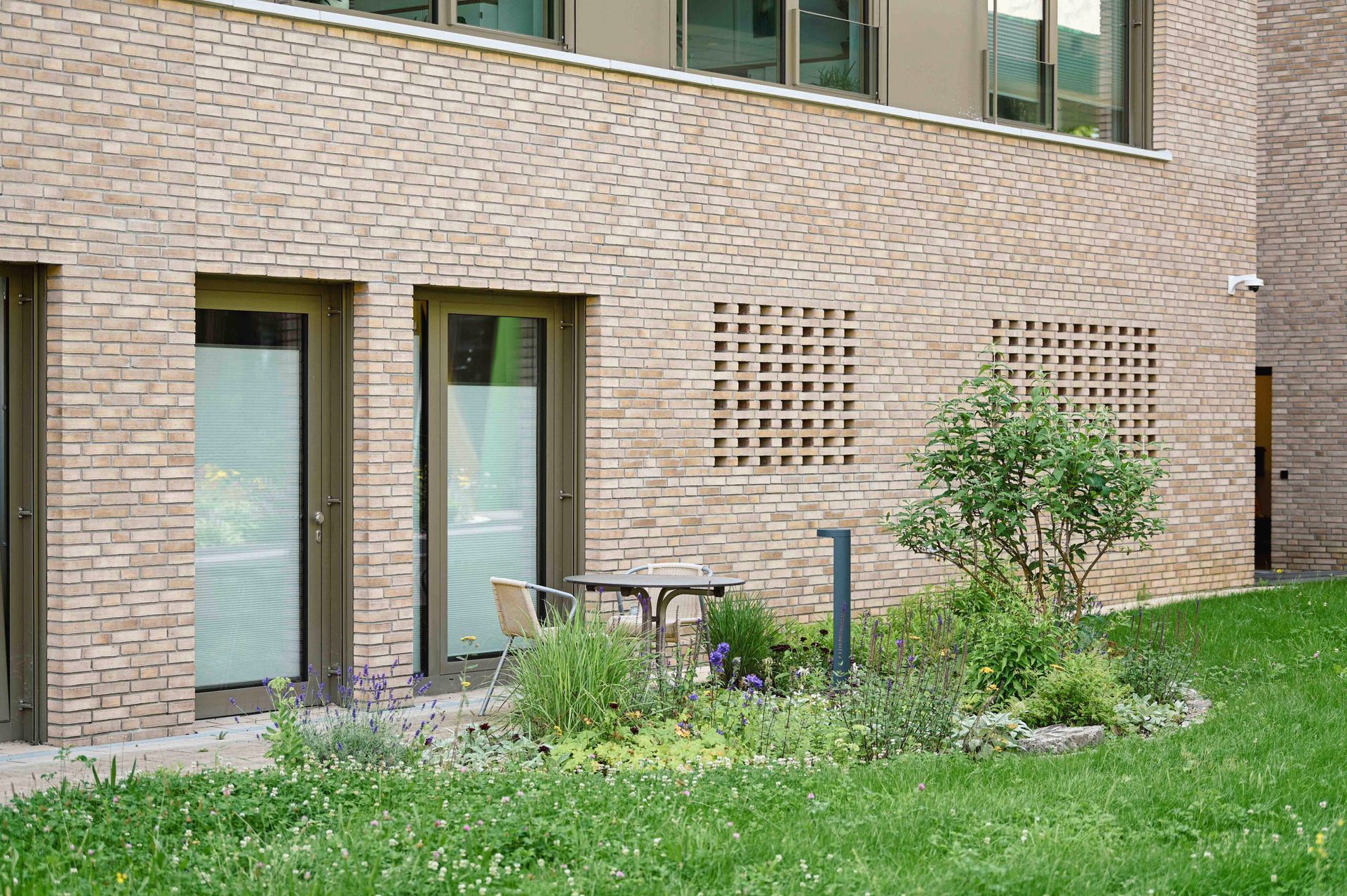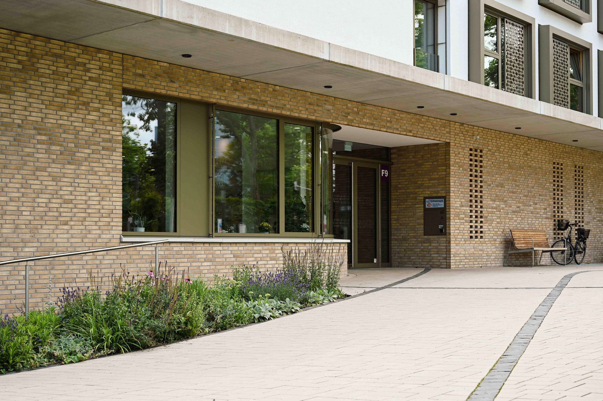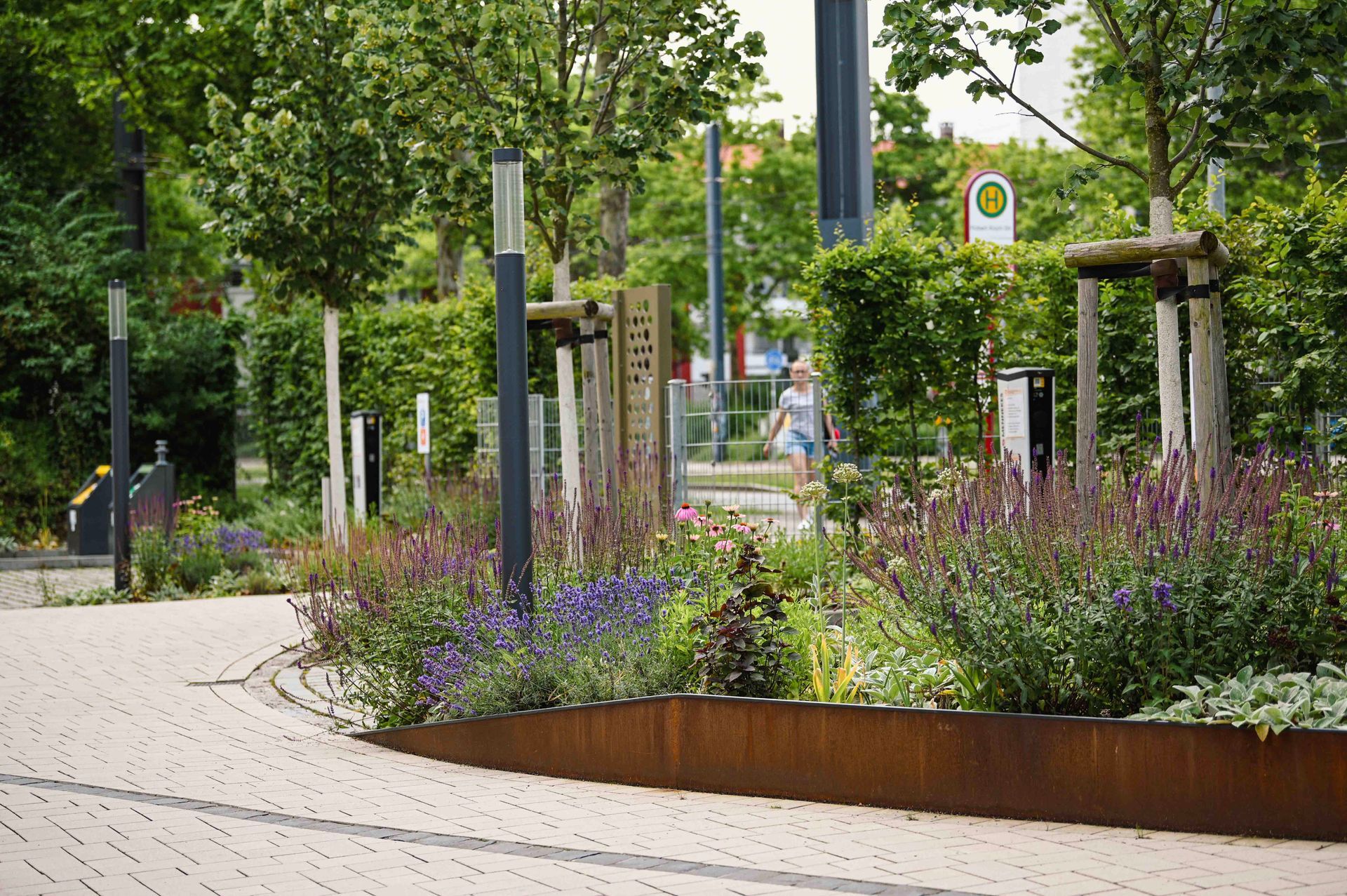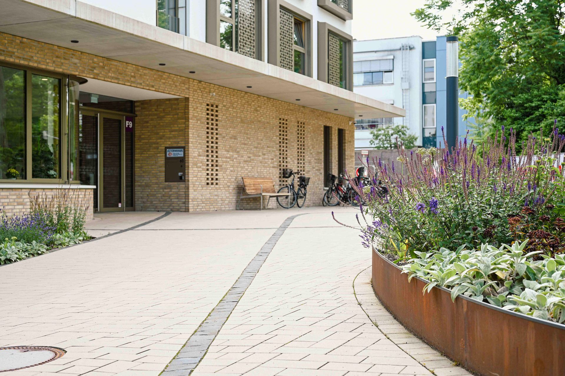 Der Entwurf nutzt den Bogen als prägendes Gestaltungselement, das sich harmonisch in die geschwungenen Formen des Klinikparks einfügt. Auf dem Vorplatz gliedern Bögen die Belagsflächen und schaffen einen spannungsvollen Kontrast zur Architektur. Besonders Pflanzflächen sorgen für Abgrenzung, während Parken und Müllentsorgung unauffällig integriert sind. Der zweigeschossige Spielbereich bietet mit Wasserlauf, Sandfläche, Kletterstrukturen und einer Bobby-Car-Bahn vielseitige Spielmöglichkeiten. Personal- und Bistro-Terrassen sind schlicht gestaltet, mit Betonplatten belegt und von Stauden eingefasst. Sämtliche Regenwassermengen werden in einer unterirdischen Versickerungsanlage zusammengeführt und dem Grundwasserkörper wieder zugeführt. Ein Pflasterband versinnbildet den Kreis der Sponsoren und ergänzt die Gestaltung. Der Entwurf verbindet Funktionalität mit einer harmonischen, landschaftsbezogenen Ästhetik.