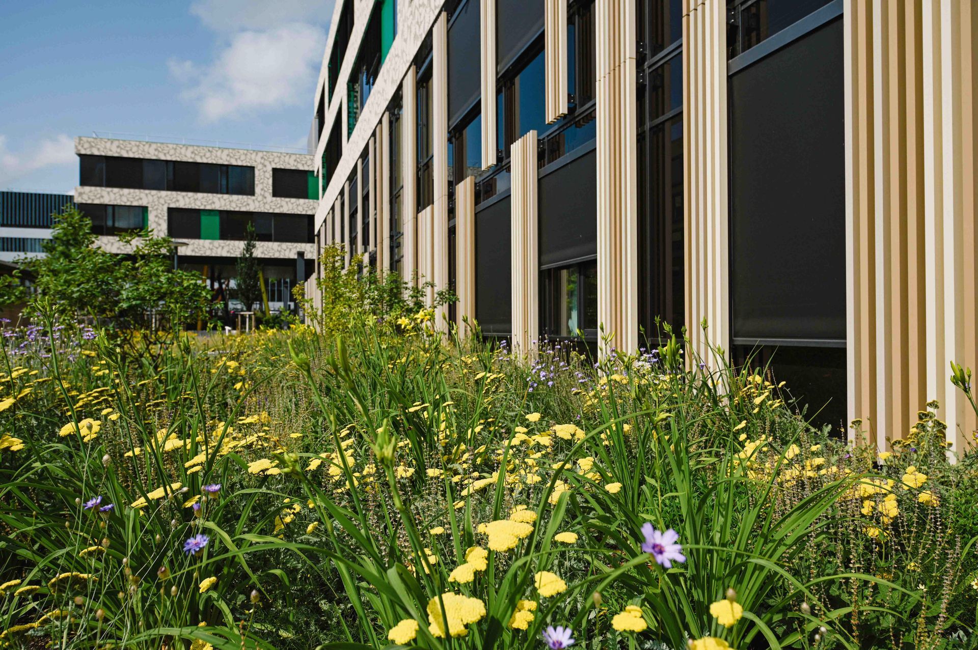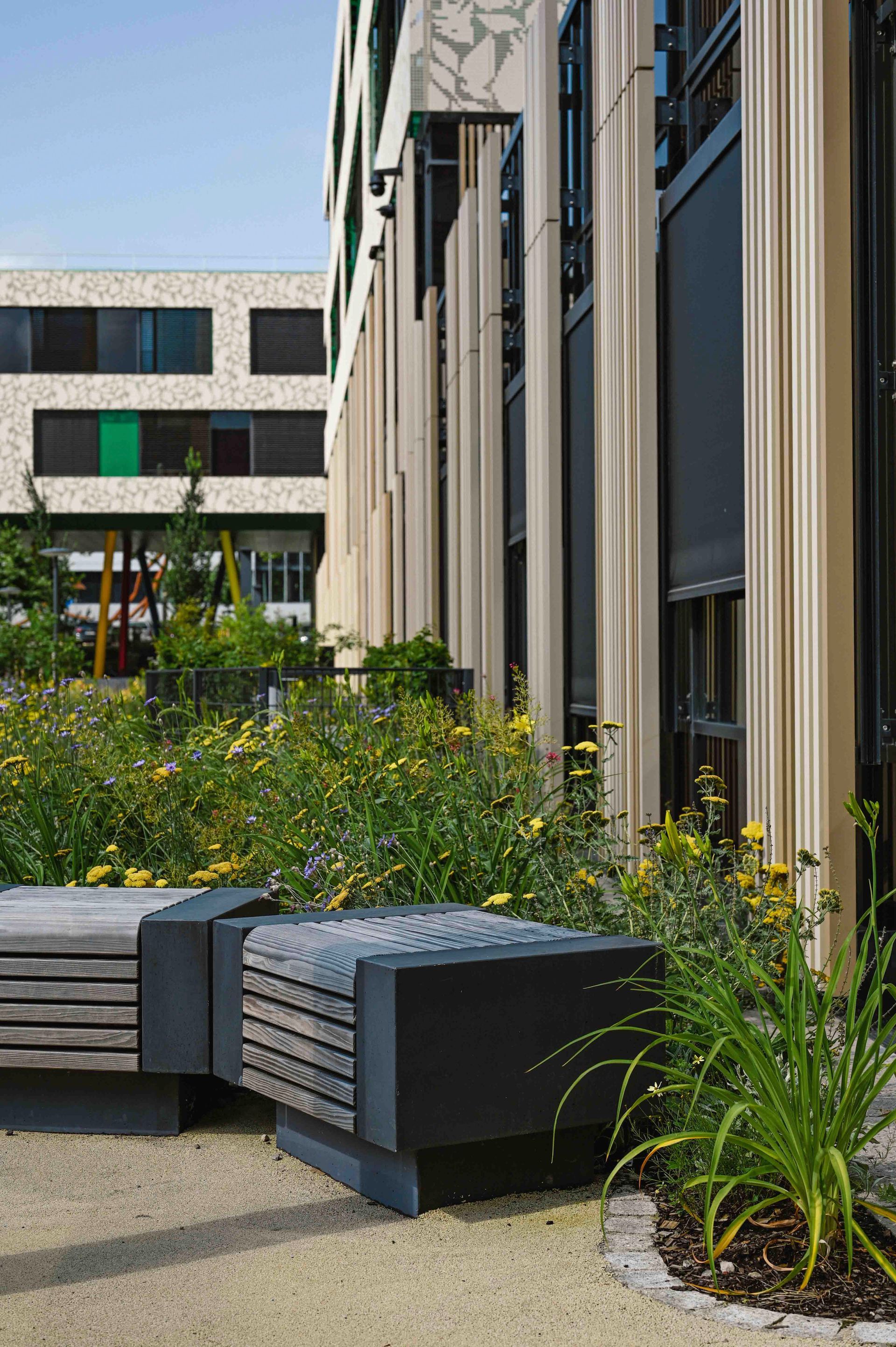 Die Kinder- und Jugendklinik erhält eine neue Adressbildung durch die Einbindung in das bestehende Klinikgelände an der Breisacher Straße. Der Haupteingang auf der Westseite präsentiert sich über einen repräsentativen Vorplatz als verknüpfendes Element zum Neurozentrum. Auf der Ostseite entsteht zwischen dem Neubau und der Strahlenklinik ein gemeinsamer Gartenbereich, welcher eine topographische Modellierung erfährt. Ein großzügiger Spielplatz mit Kletterfelsen und eine offene Spielwiese zentrieren den neuen Park und bieten Aufenthaltsmöglichkeiten. Sämtliche Dachflächen des Neubaus werden mit einer Dachbegrünung ausgeführt. Das gesamte Oberflächenwasser wird über entsprechende mikrobiologische Passagen in unterirdische Versickerungsanlagen geführt.