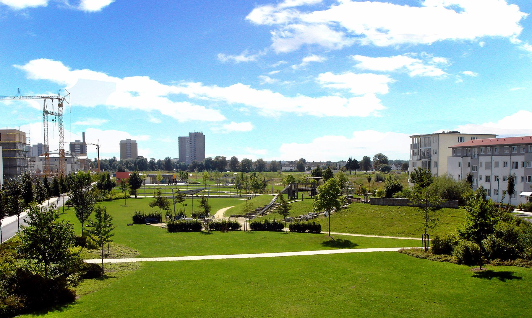 Auf dem Areal einer früheren Kaserne mit 76 ha entsteht ein neues Wohn- und Arbeitsquartier. Kernstück des neuen Viertels ist die zentrale Grünachse, die zugleich eine wichtige Grünverbindung zwischen der Innenstadt und den südlichen Stadtteilen darstellt. Um gleich zu Beginn ein qualitätsvolles Wohnumfeld zu schaffen, wird der Park vor der Bebauung realisiert, ein Novum im gängigen Planungsablauf. Aussichtsturm, Abenteuerspielplatz, Jugendtreff und vielfältig gestaltete Sitzbereiche sind von großzügigen Wiesenflächen umgeben und bieten ein abwechslungsreiches Freizeitangebot für die Erholungssuchenden. Prägende Elemente sind der Abenteuerspielhügel sowie der Aussichtsturm in Form einer begehbaren Stahlskulptur.