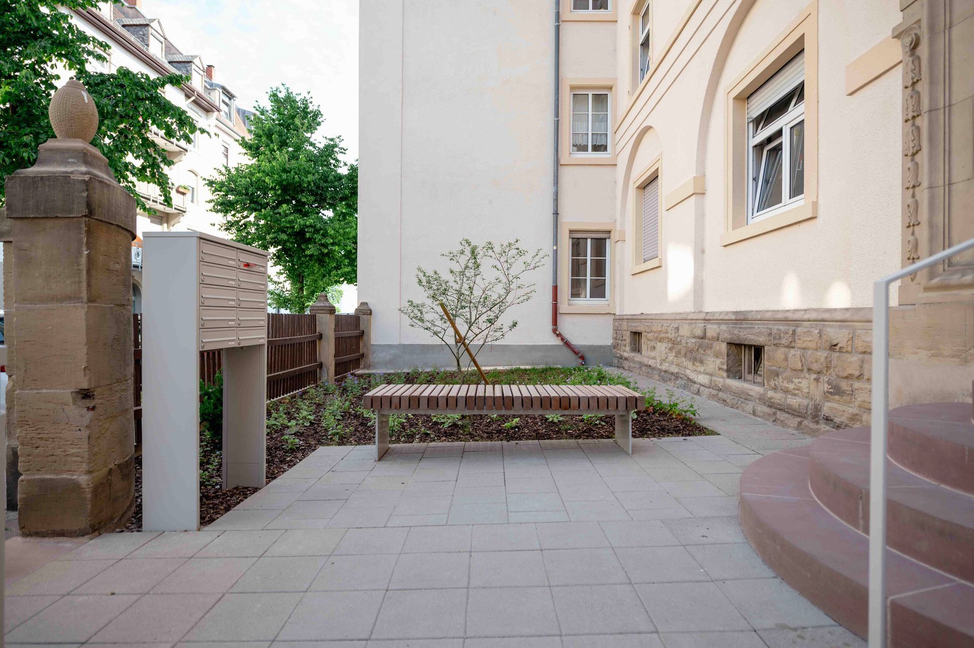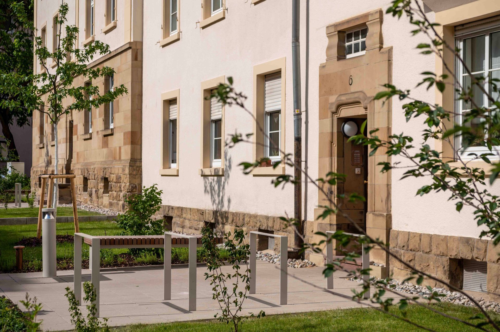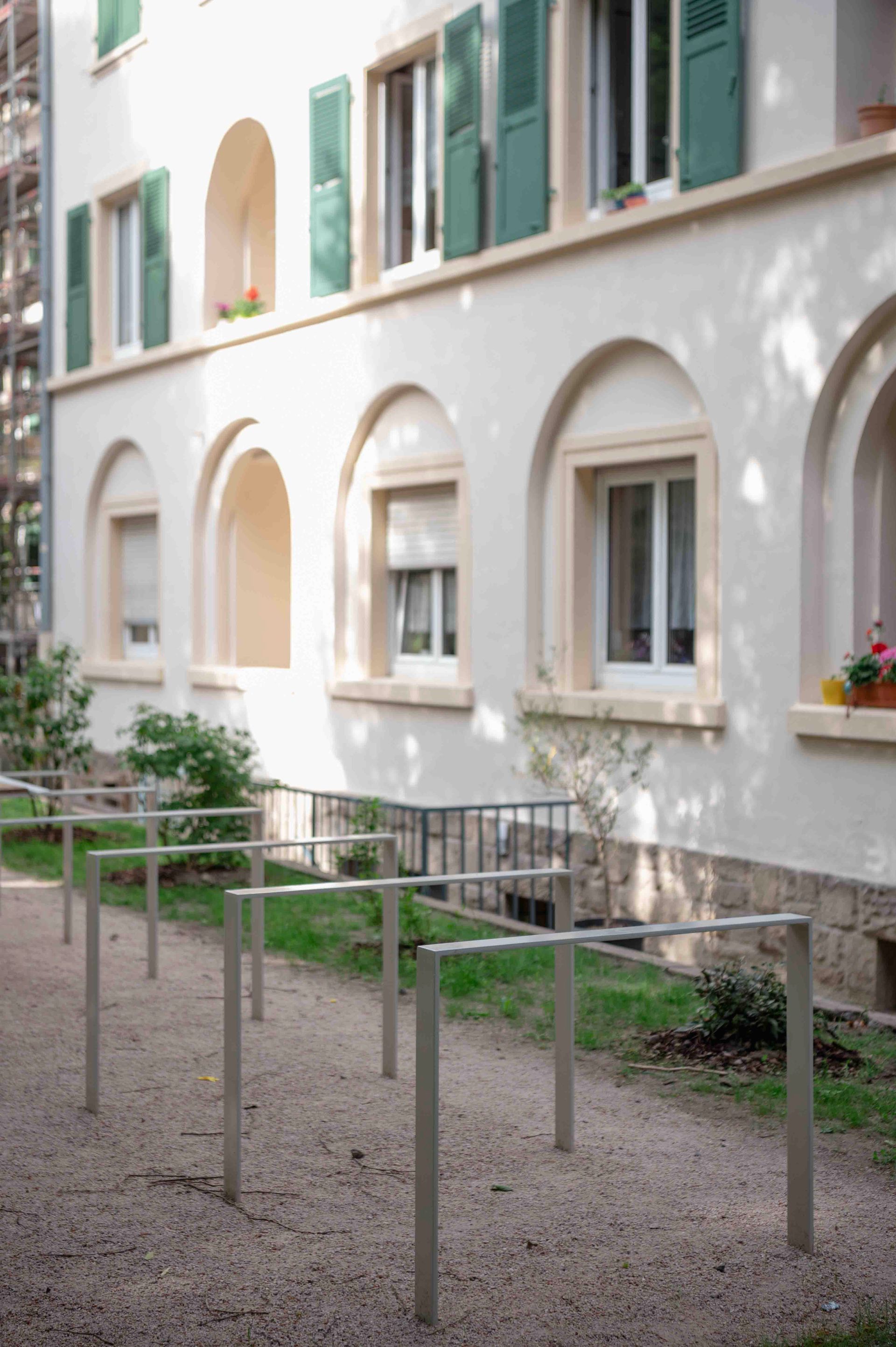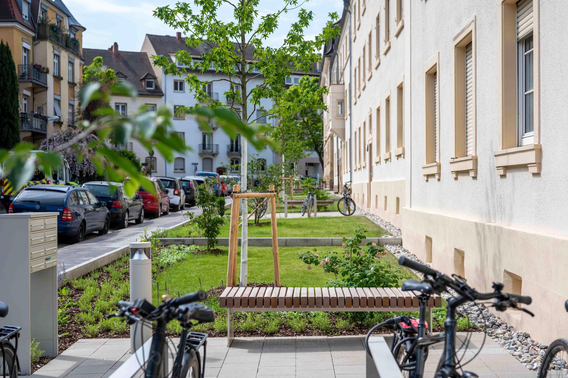 Der historische „Brahmsblock“ aus den 1920er-Jahren steht als Gesamtensemble unter Denkmalschutz. Die Blockrandbebauung umschließt einen weitgehend unbebauten Innenhof mit dichtem, waldartigem Baumbestand. Zur Philipp- und Kalliwodastraße liegen schmale Vorgärten mit Hauszugängen. Ziel der Umgestaltung ist ein einheitliches Erscheinungsbild des Wohnblocks. Vorgesehen sind eine einfassende Zaunanlage zur Straße, klar gegliederte Hausvorzonen mit Wegen, Fahrradstellplätzen und gestalteten Gartenflächen. Baumpflanzungen betonen die Gebäuderythmik und Hauszugänge. Material und Farbigkeit orientieren sich am Bestand und fügen sich harmonisch in die hellen Fassaden ein. Der Innenhof wird in Erschließungs-, Hausgarten- und Aufenthaltsbereiche gegliedert weiter aufgewertet.
