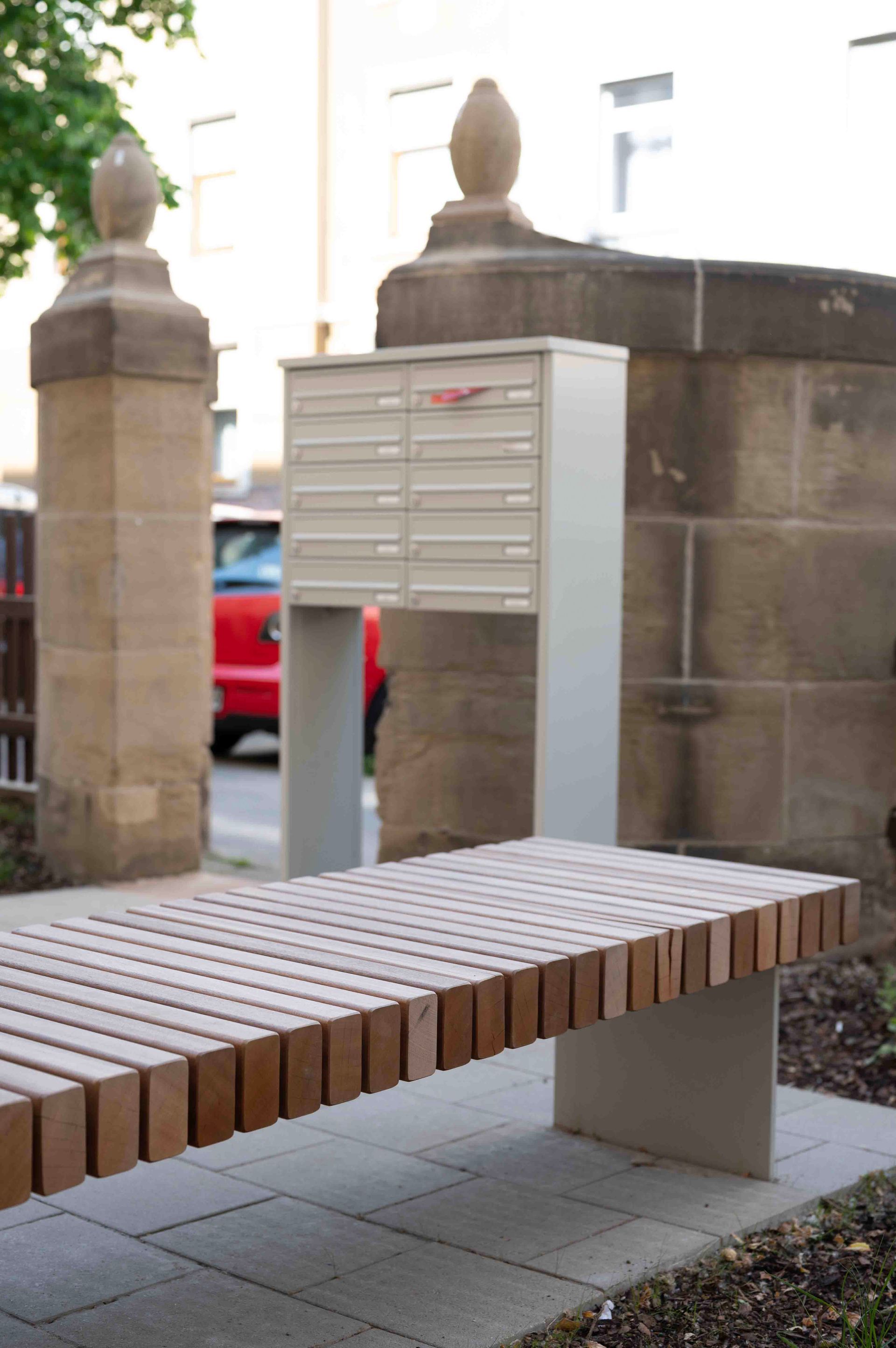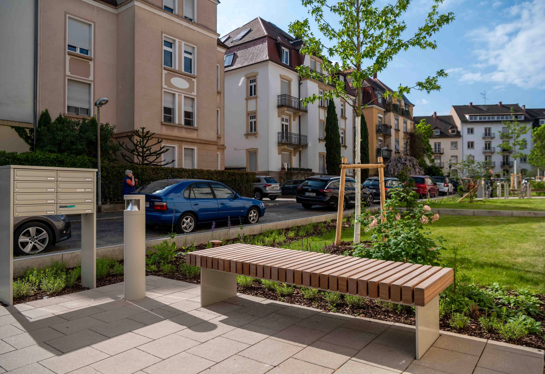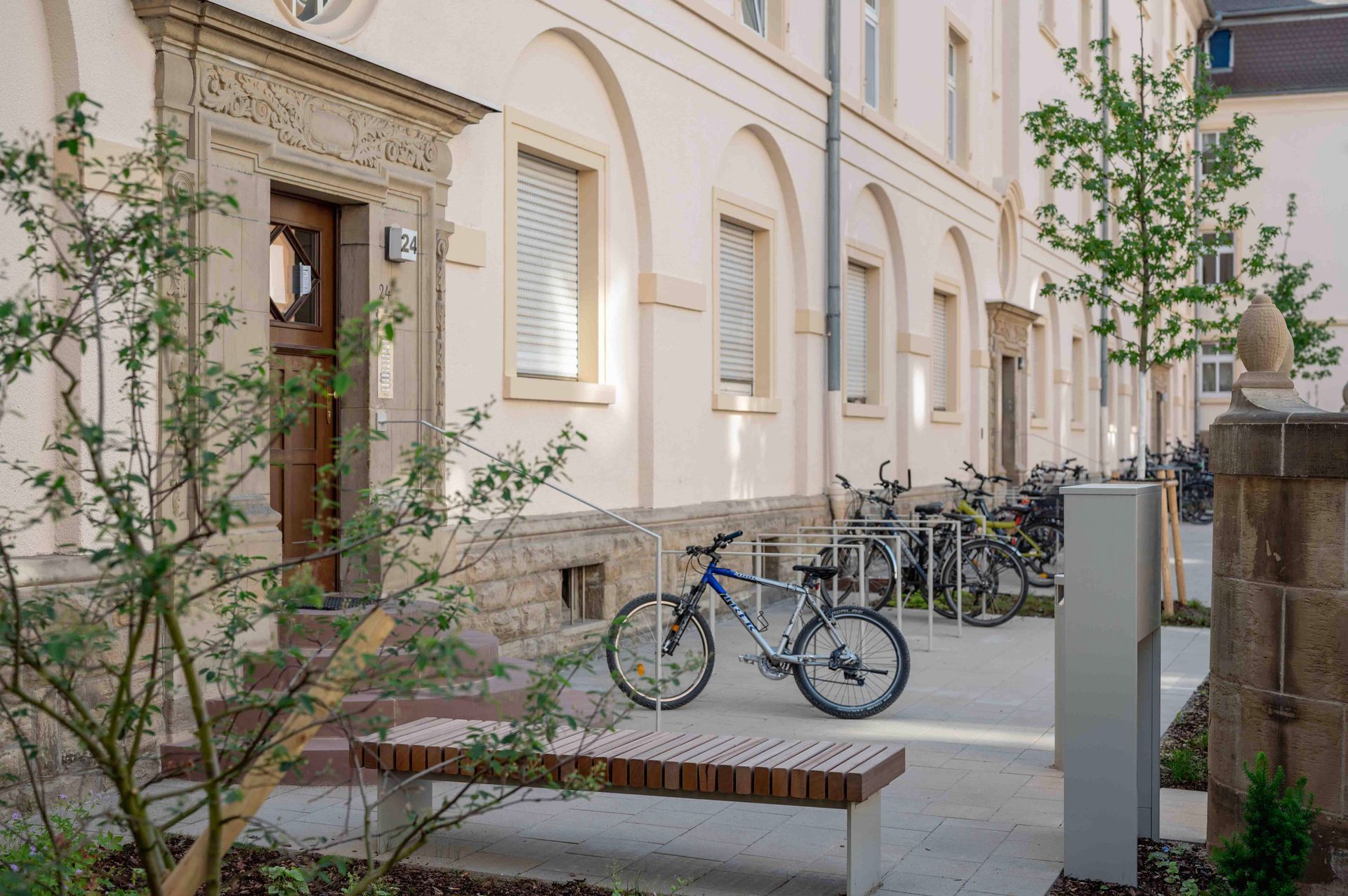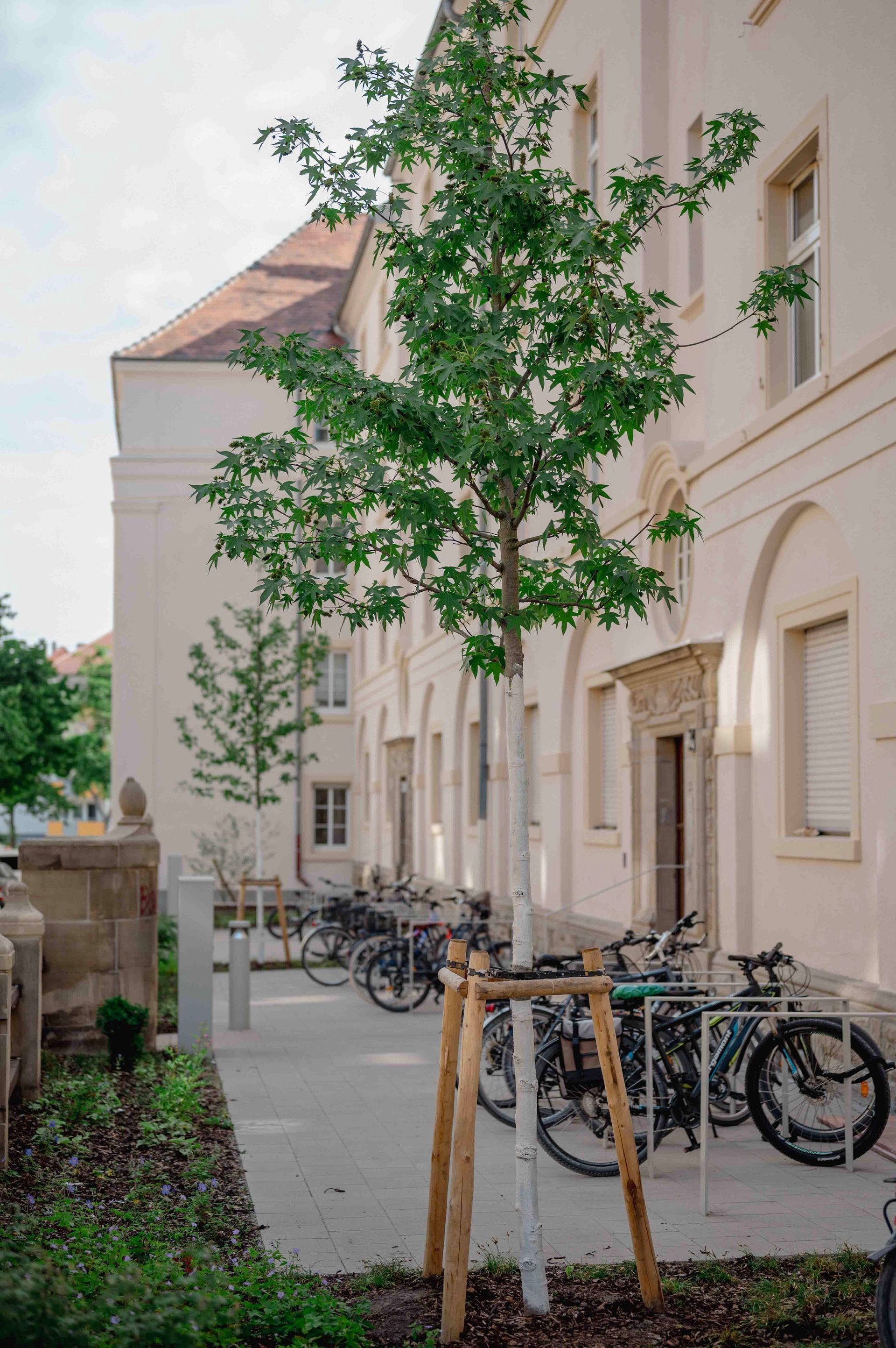 Der historische „Brahmsblock“ aus den 1920er-Jahren steht als Gesamtensemble unter Denkmalschutz. Die Blockrandbebauung umschließt einen weitgehend unbebauten Innenhof mit dichtem, waldartigem Baumbestand. Zur Philipp- und Kalliwodastraße liegen schmale Vorgärten mit Hauszugängen. Ziel der Umgestaltung ist ein einheitliches Erscheinungsbild des Wohnblocks. Vorgesehen sind eine einfassende Zaunanlage zur Straße, klar gegliederte Hausvorzonen mit Wegen, Fahrradstellplätzen und gestalteten Gartenflächen. Baumpflanzungen betonen die Gebäuderythmik und Hauszugänge. Material und Farbigkeit orientieren sich am Bestand und fügen sich harmonisch in die hellen Fassaden ein. Der Innenhof wird in Erschließungs-, Hausgarten- und Aufenthaltsbereiche gegliedert weiter aufgewertet.