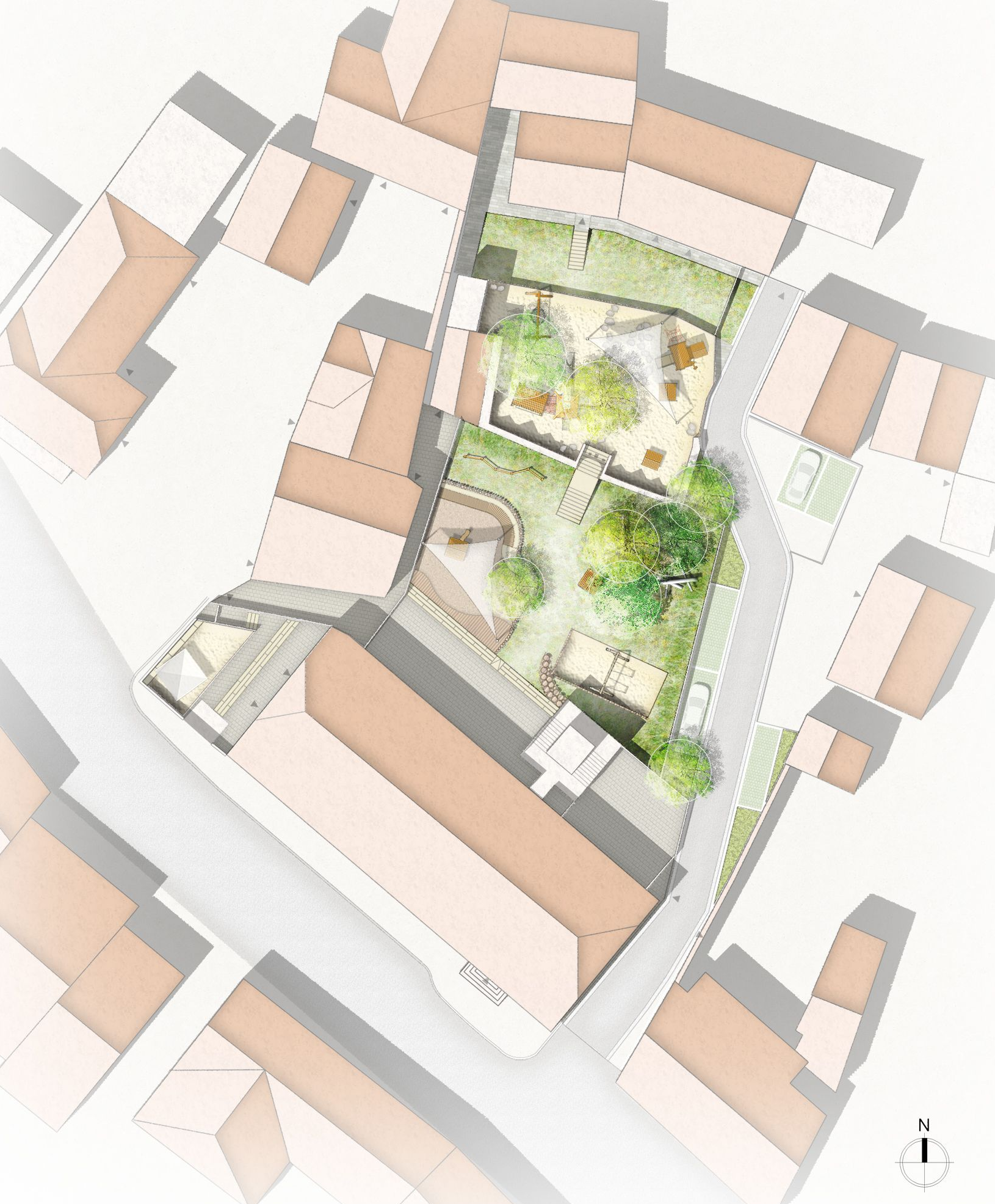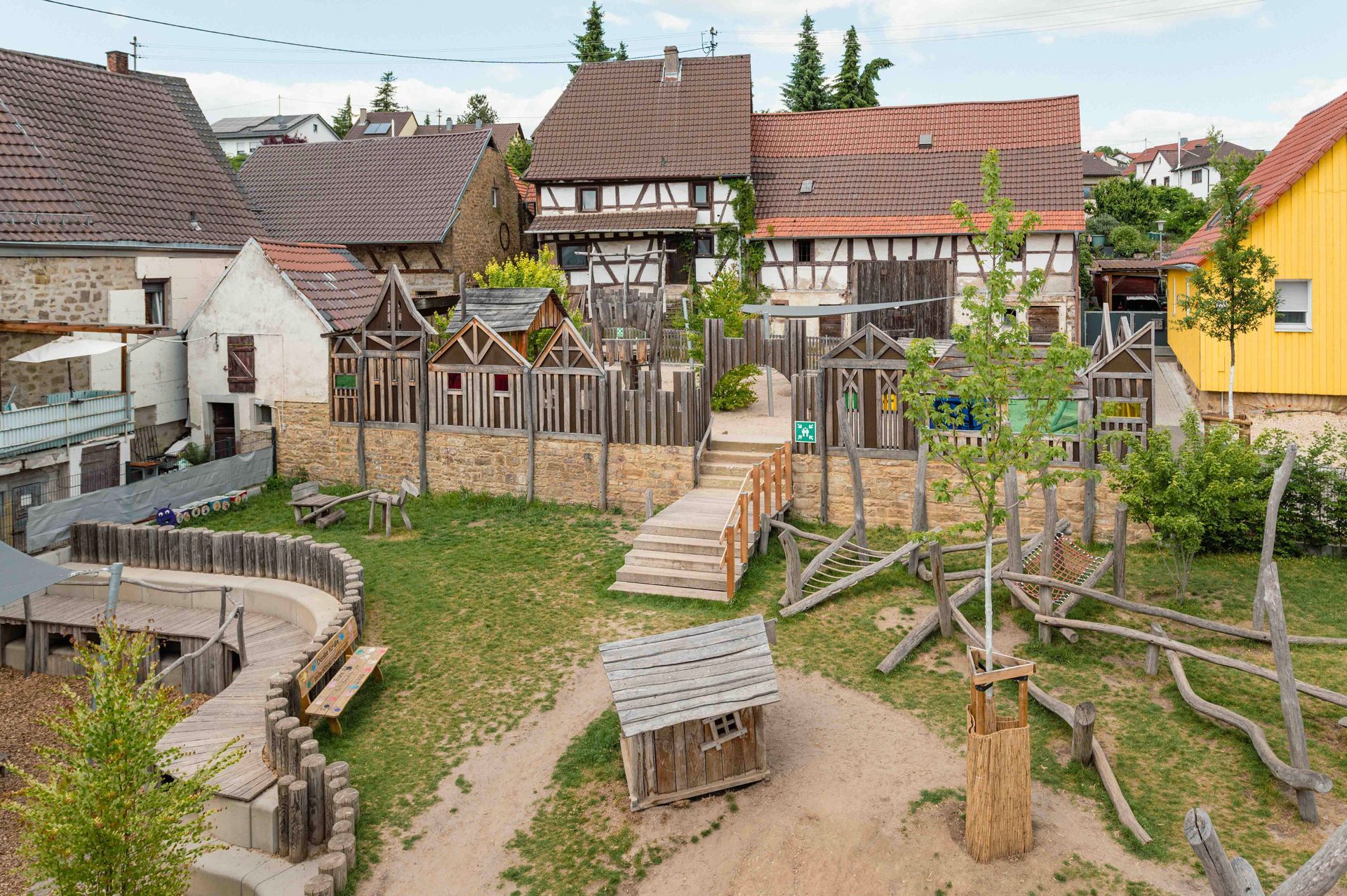 Für den Kindergarten "Maria Stern" in Östringens Stadtteil Odenheim wurden die Außenanlagen neugestaltet. Der Spielbereich liegt auf zwei Ebenen, die Kulisse dafür ist in Form eines Mittelalterlichen Dorfes dargestellt. Ein Band aus drei Stufen gleicht den Höhenunterschied der Ebenen aus. Eine an die Stufen angrenzende Sandfläche ist durch einen Zaun aus Holzpalisaden von der unterhalb liegenden Fläche abgegrenzt. Ein Holzdeck mit integriertem Baumquartier ist in die untere Fläche eingebettet. Alle sich auf dem Gelände befindlichen Spielgeräte sind aus Robinienholz gefertigt und stammen aus nachhaltiger Forstwirtschaft. Im Ganzen entstand ein großzügiger und abwechslungsreicher Spielbereich für alle Altersstufen der Kindergartenkinder.