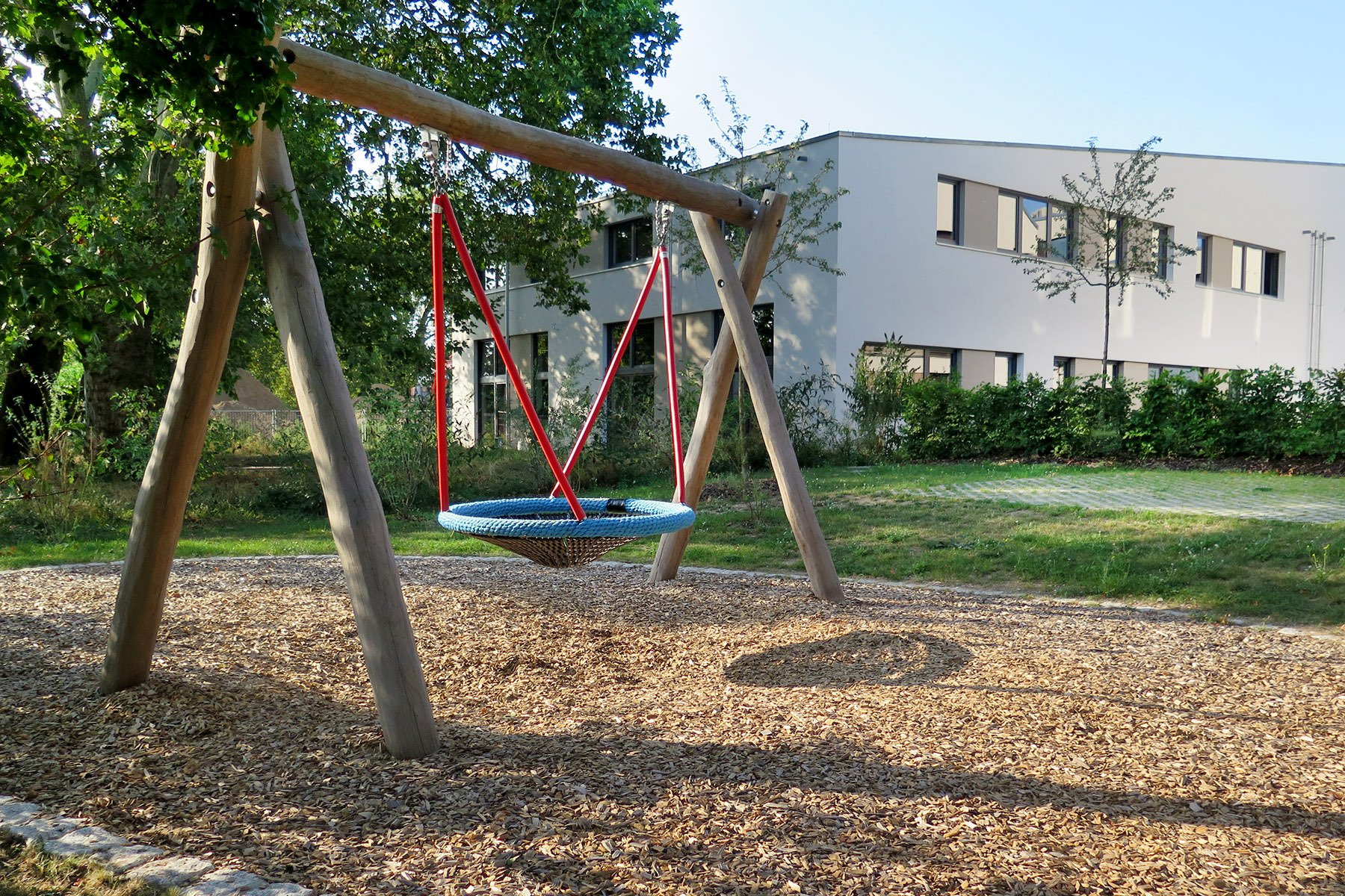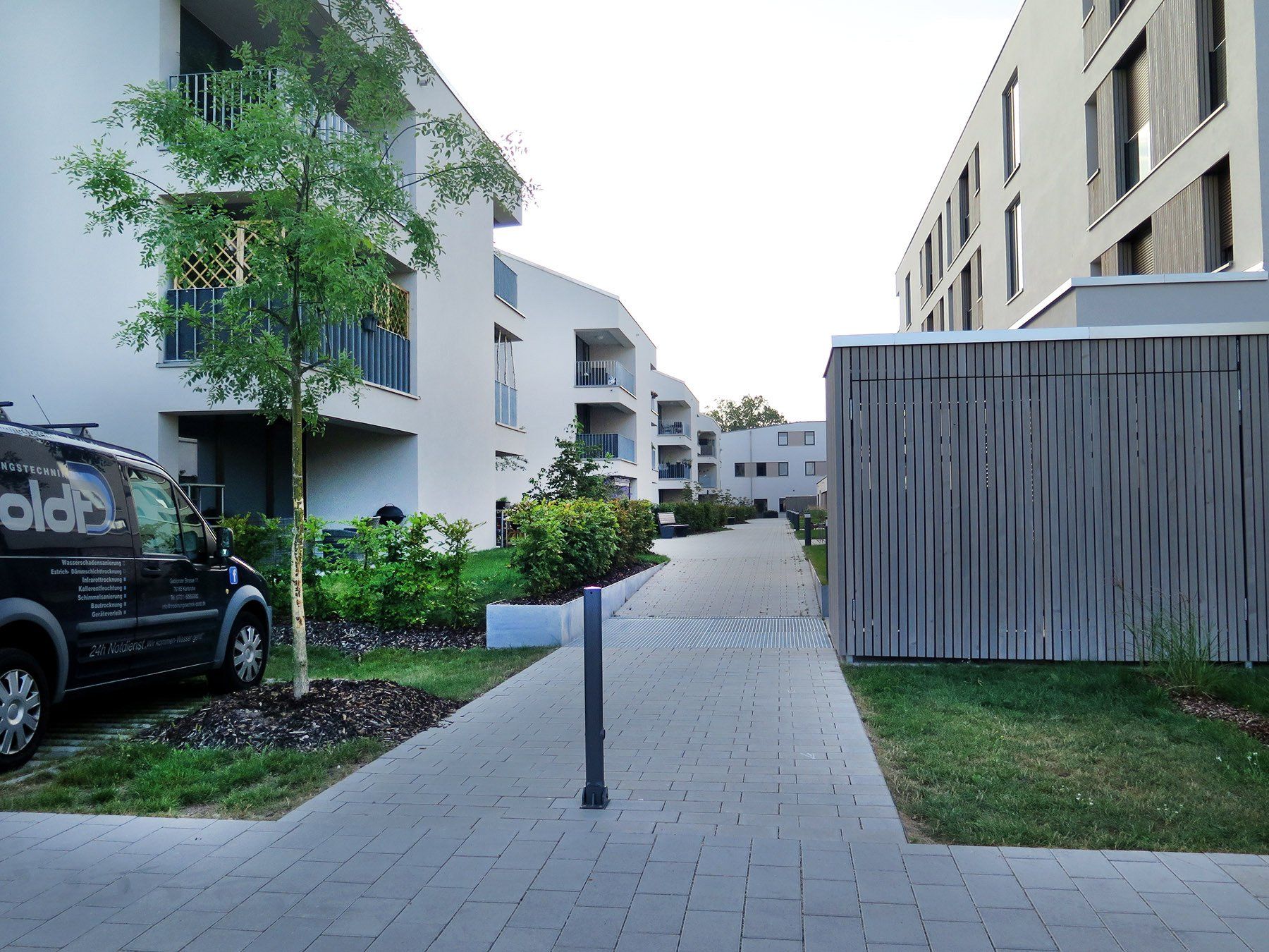 Im Zuge des Projekts entstanden sechs Wohngebäude mit Tiefgarage, sowie die Anlage extensiver Begrünung auf den Dächern. Der Freiraum wird geprägt von halböffentlichen und den Punkthäusern vorgelagerten privaten Bereichen. Letztere werden durch geschnittene Hecken gefasst. Ein zentraler Erschließungsweg mit Stichwegen führt in die Anlage hinein. Die südwestlichen Eingänge der Zeilenhäuser werden direkt von der Egon-Eiermann-Allee erschlossen. An der nordöstlichen Grundstücksseite wurde ein Spielplatz errichtet. Sowohl in der Tiefgarage, als auch in der Nähe der Eingänge entstanden Fahrradstellplätze. Westlich des Grundstücks entstanden Parkplätze für Besucher. Daran angrenzend wurde ein Eidechsen-Habitat gestalterisch integriert.