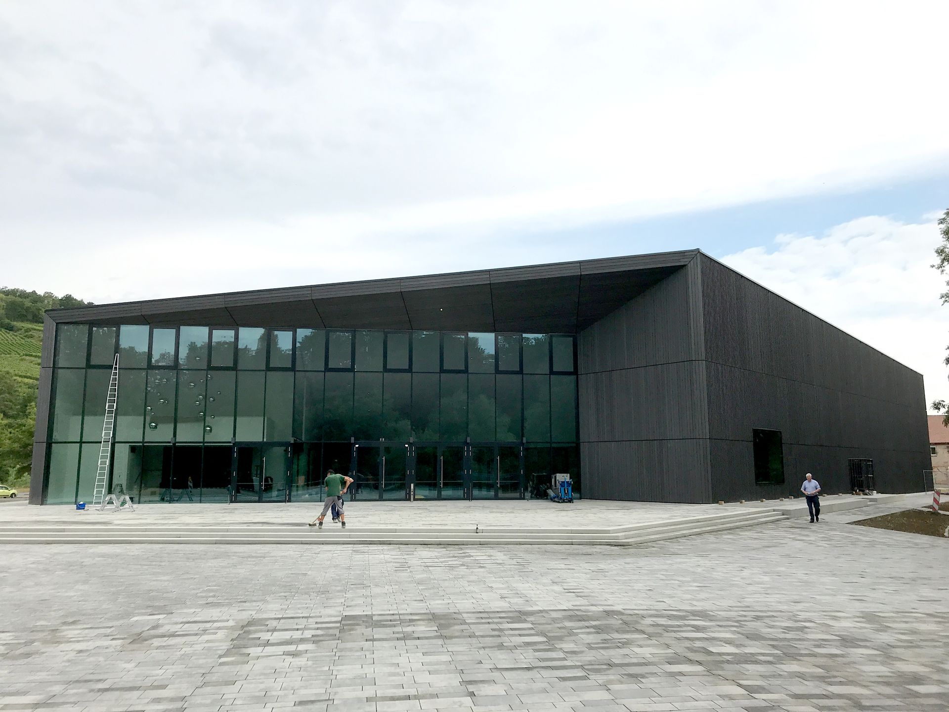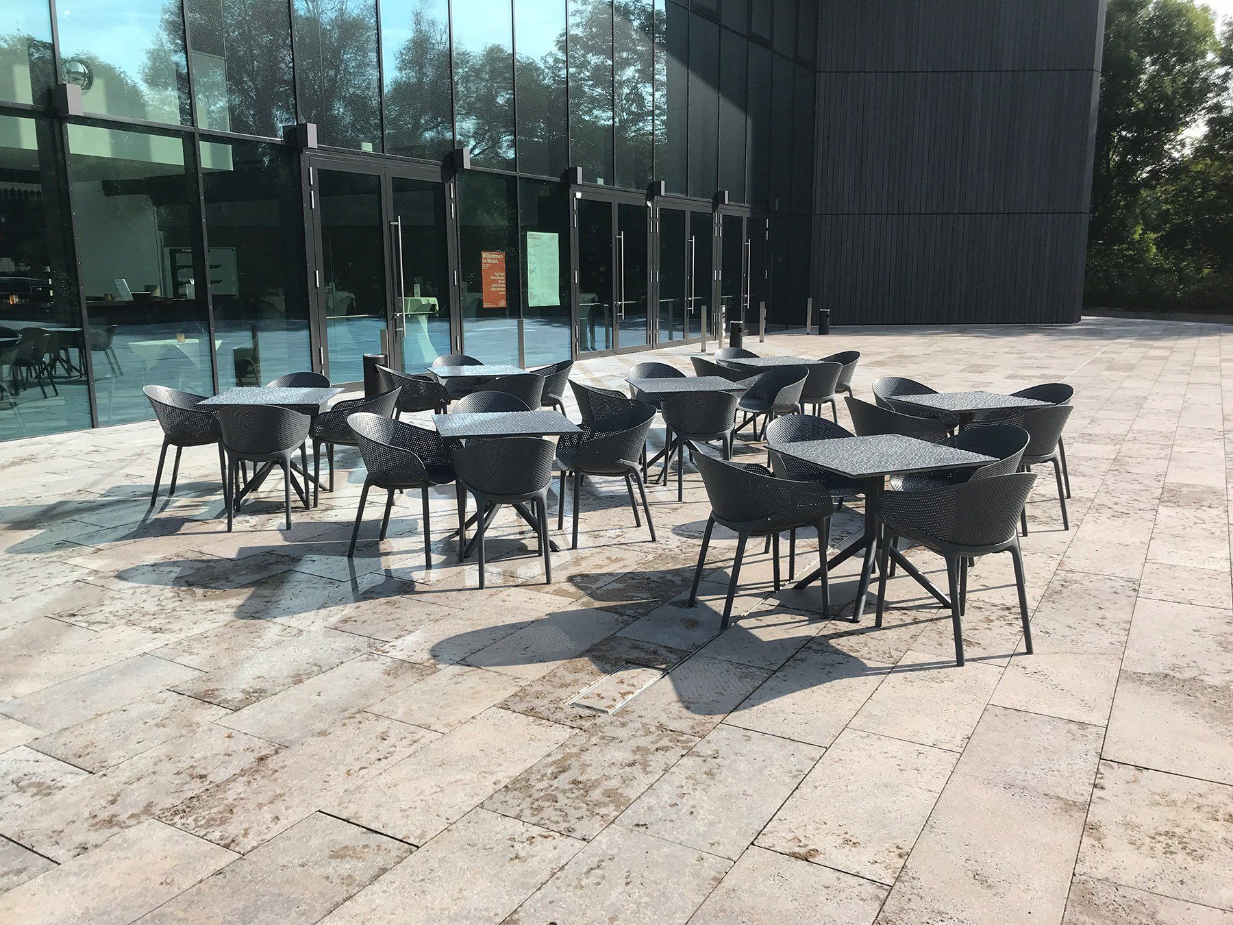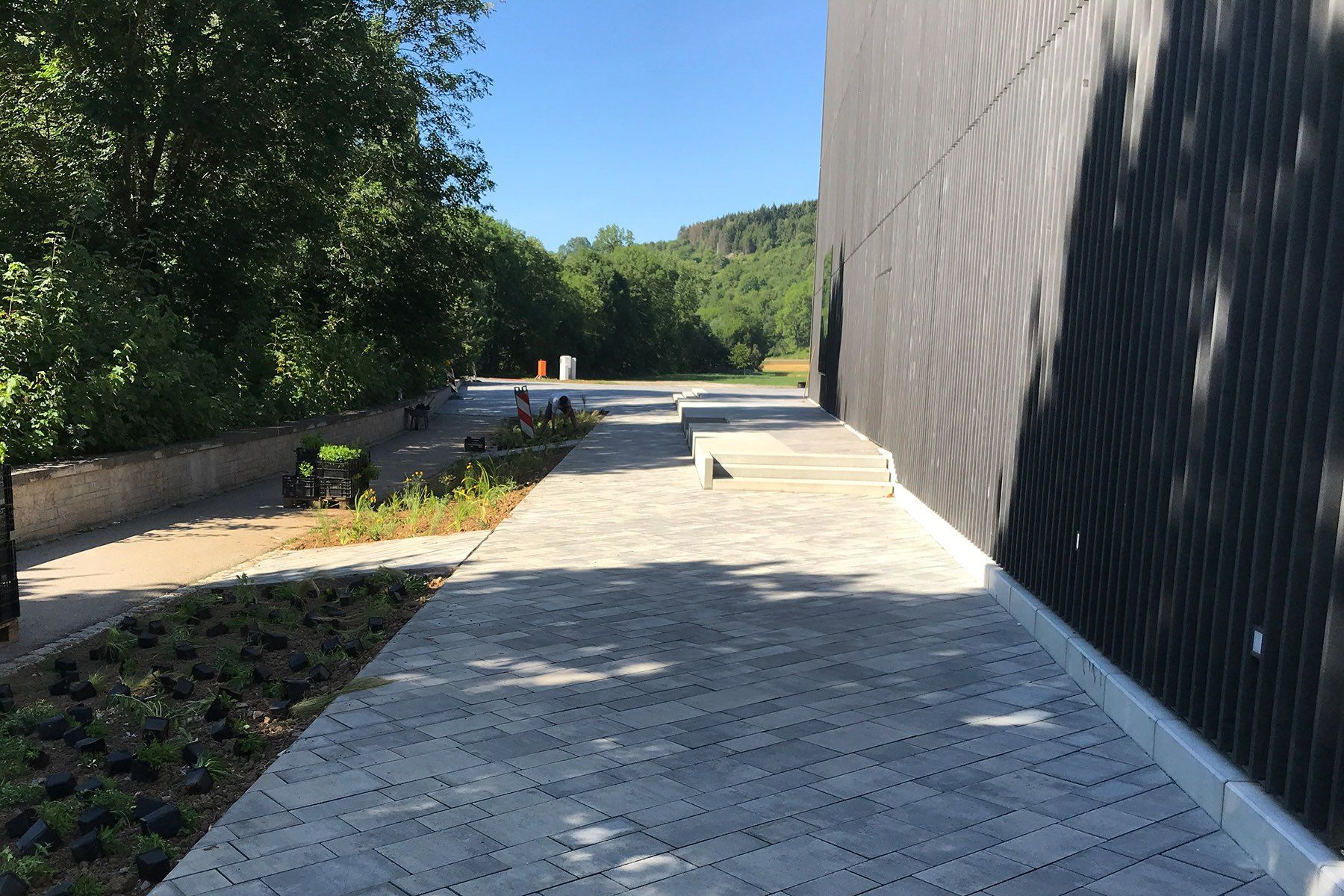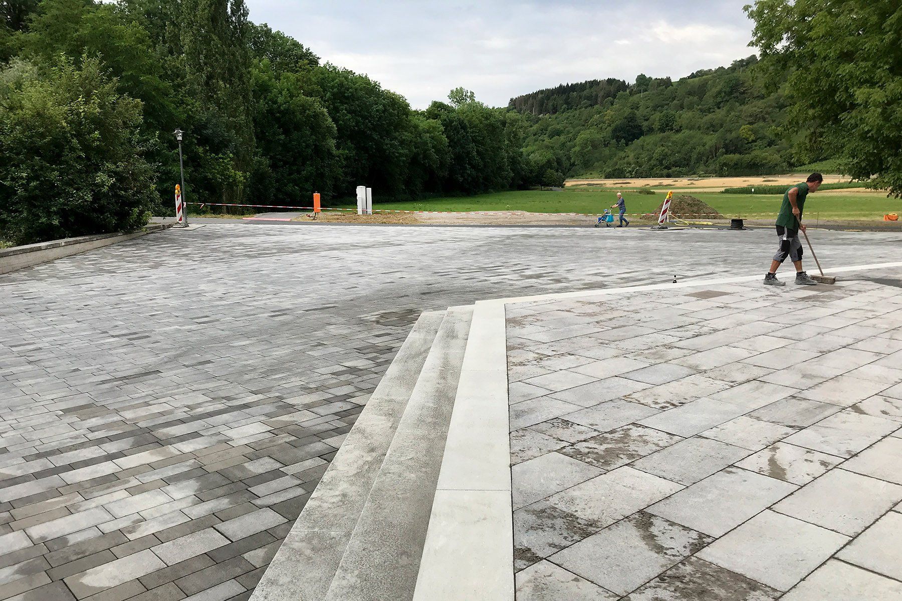 Vom Parkplatz in den Tauberwiesen kommend erschließt sich ein offener und weiträumiger Vorplatz aus Muschelkalk-Platten hin zur neuen Tauber-Philharmonie. Den Übergang zum Eingang bildet eine großzügige Stufenanlage aus hellen Beton-Blockstufen, die zur Tauber hin in Sitzblöcken mündet und auf der Parkplatzseite als behindertengerechte Rampe ausläuft. So entsteht ein oberer Platz, der in seiner Form und Materialität aus quadratischen, großformatigen Betonplatten mit dem Foyer korrespondiert und als Caféterrasse genutzt wird. Die hellen Farben und die Schlichtheit des Vorplatzes kontrastieren mit der dunklen Fassade des Gebäudes und geben der Philharmonie einen würdigen Rahmen.