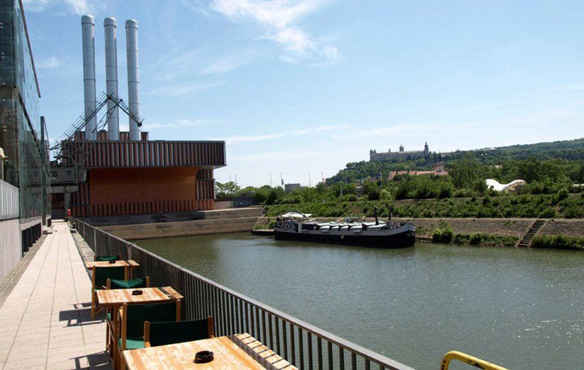 Im alten Hafengebiet in Würzburg wurde zwischen Kohlekran und Weinberge ein neues Stück Mainufer für die Bevölkerung erschlossen. Im Mittelpunkt steht der Kulturspeicher, der als ehemaliges Lagerhaus in einen Museums- und Galeriebau zum "Kulturspeicher“ umgebaut wurde. Der Promenadenweg zwischen Bebauung und Kaimauer verbindet alle Nutzungen zwischen Museum, CinemaxX und Parkhaus im Sanierungsgebiet. Als verbreiterter Stahl-Holzsteg führt er kreuzungsfrei unter der Brücke der Deutschen Einheit zum angrenzenden Parkhaus. Für ein einheitliches Gesamtkonzept wurden Materialien, gleich in Form und Farbe für die Beläge, Beleuchtung und Baumauswahl getroffen. Dieses war möglich, da der Bauherr, die Stadt Würzburg, stellvertretend für alle 3 Bauten die entscheidende Planungshoheit hatte. Der verkehrsfreie Platz vor dem Kulturspeicher wirkt als offener städtischer Raum großzügig und einladend. Der großformatige Pflasterverband in Reihen bestimmt die Platzstruktur und zeichnet gleichzeitig die Entwässerungsläufe auf dem Platz ab. Die Platanenreihe an der Platzkante bindet an den historischen Ringpark der Stadt Würzburg an.