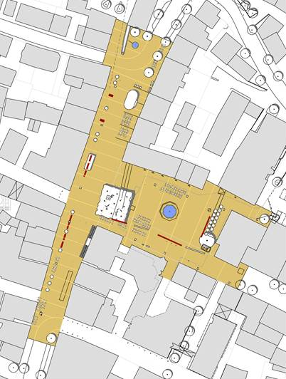 Die Sichtachse Rathaus und Stadtkirche St. Dionysius ist von Bäumen freigehalten. Die Staffel zur Stadtkirche und der kleine Platz am "Neckar und Sulm“ Brunnen ist in das städtebauliche Gesamtkonzept mit einem Holzdeck für die Gastronomie verbunden und eingebunden