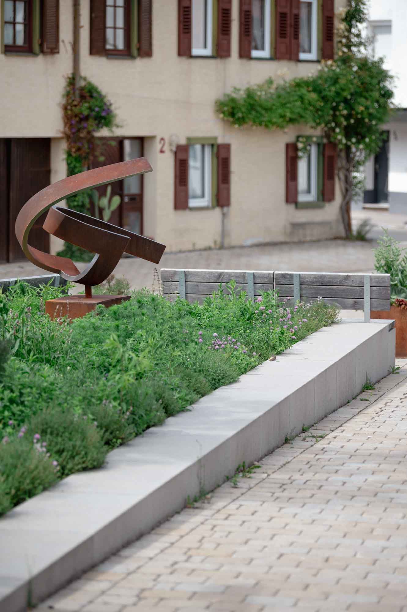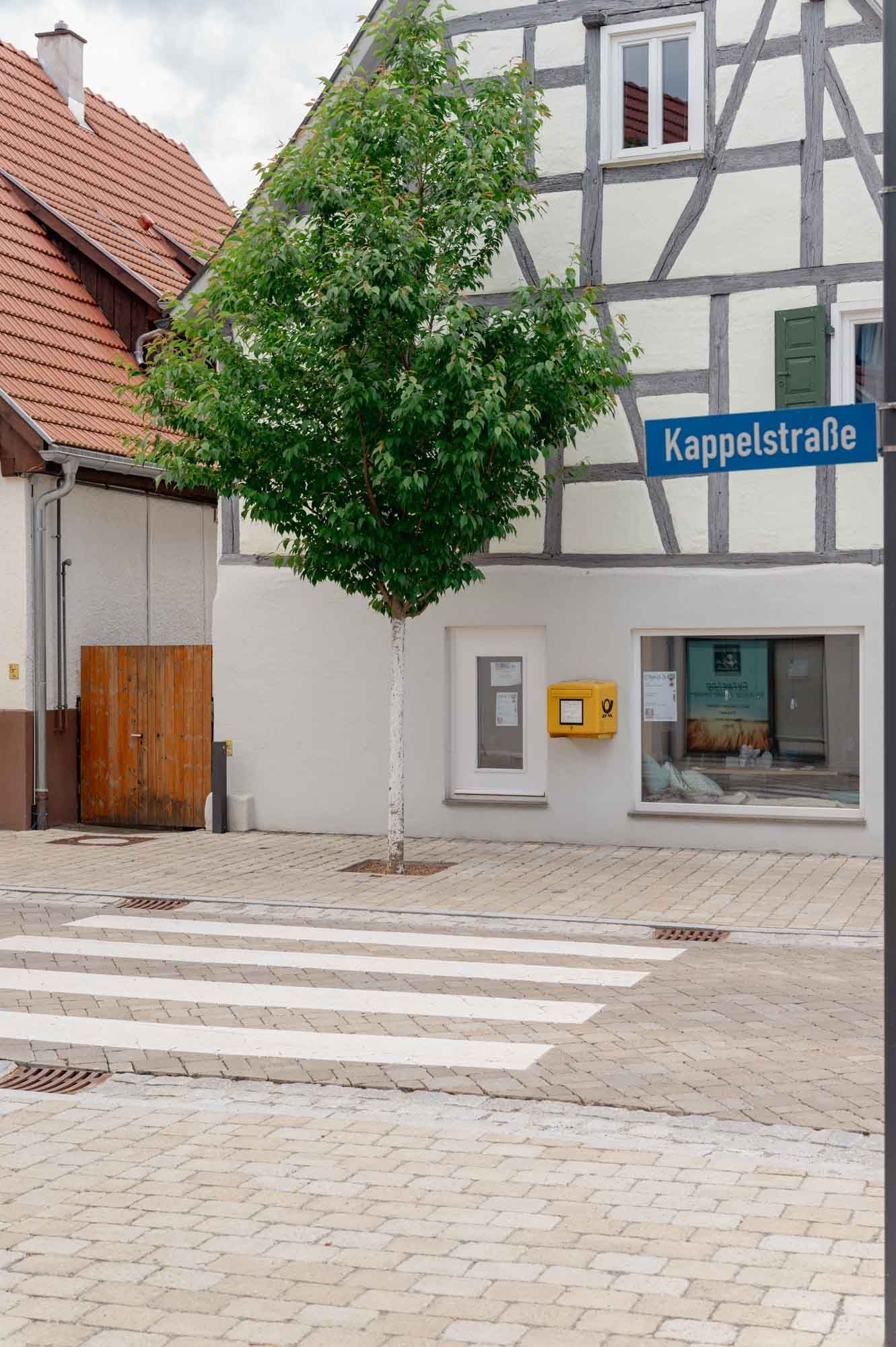 Die Gemeinde Nehren besticht durch ihren einzigartigen Ortskern, der von denkmalgeschützten Fachwerkhäusern und umgebenden alten Streuobstwiesen geprägt ist. Der Rathaus-platz und das Ortszentrum werden umfassend aufgewertet und zu einladenden Platzbereichen umgestaltet. Die Straßenführung erhält ein einheitliches Profil, das durch beidseitige Ent-wässerungsrinnen strukturiert wird. Eine weitere gestalterische Maßnahme ist eine locker gesetzte Baumreihe, die im Ortskern dichter wird.