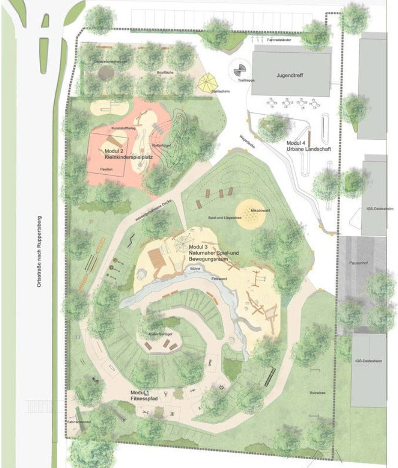 Die sanften Hügel und Rebhänge der Pfälzer Weinlandschaft und die Sandsteinfelsen des Pfälzer Waldes waren die Leitmotive für die Planung. Als erste Stadt in Rheinland-Pfalz wurde Deidesheim 2009 zur "Cittàslow“ erhoben. Deidesheim wirbt mit dem Slogan „eine der weltweiten Gemeinden und Städte zu sein, die versuchen, den Zeitgeist für sich zu interpretieren und gleichzeitig den individuellen Charakter in der Gemeinde zu bewahren“. Im Lichte der „Langsamkeit“, des Genusses und der Gesundheit entstand im Planungsprozess ein neuer Weinhang, der in Schneckenform und im Schneckentempo erkundet werden kann. Aber nicht nur im Laufen, sondern im Ausprobieren von 17 den Weg begleitenden Übungs- und Fitnessgeräten für „Jedermann“ führt er auf einen kleinen Aussichtspunkt mit Sandsteinquadern als Sitzplateau – Baumelbänke mit 90 cm Sitzhöhe nach dem Sport inbegriffen.