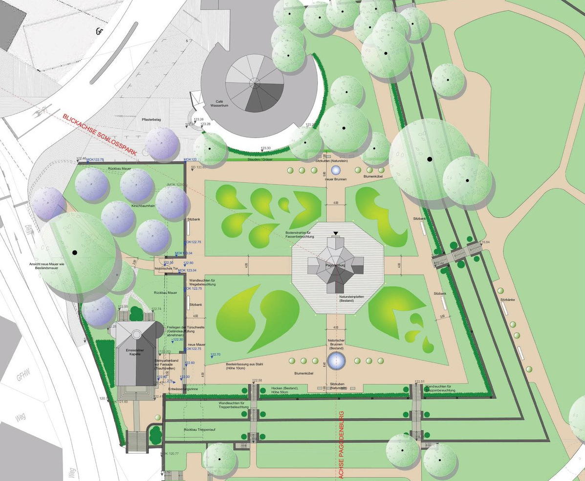 Ziel der Umgestaltung und Sanierung der Pagodenburganlage war unter Erhaltung der historischen Gestaltungsmerkmale die Schaffung einer offenen Park- und Gartenanlage mit hoher Aufenthaltsqualität. Die grundlegenden Gestaltungsmerkmale der barocken Gartenanlage um die Pagodenburg wurden durch eine einfache und klare Gestaltung betont.