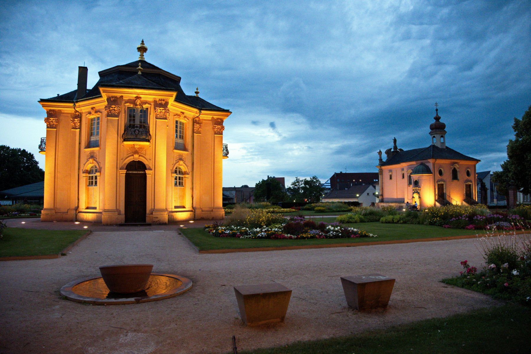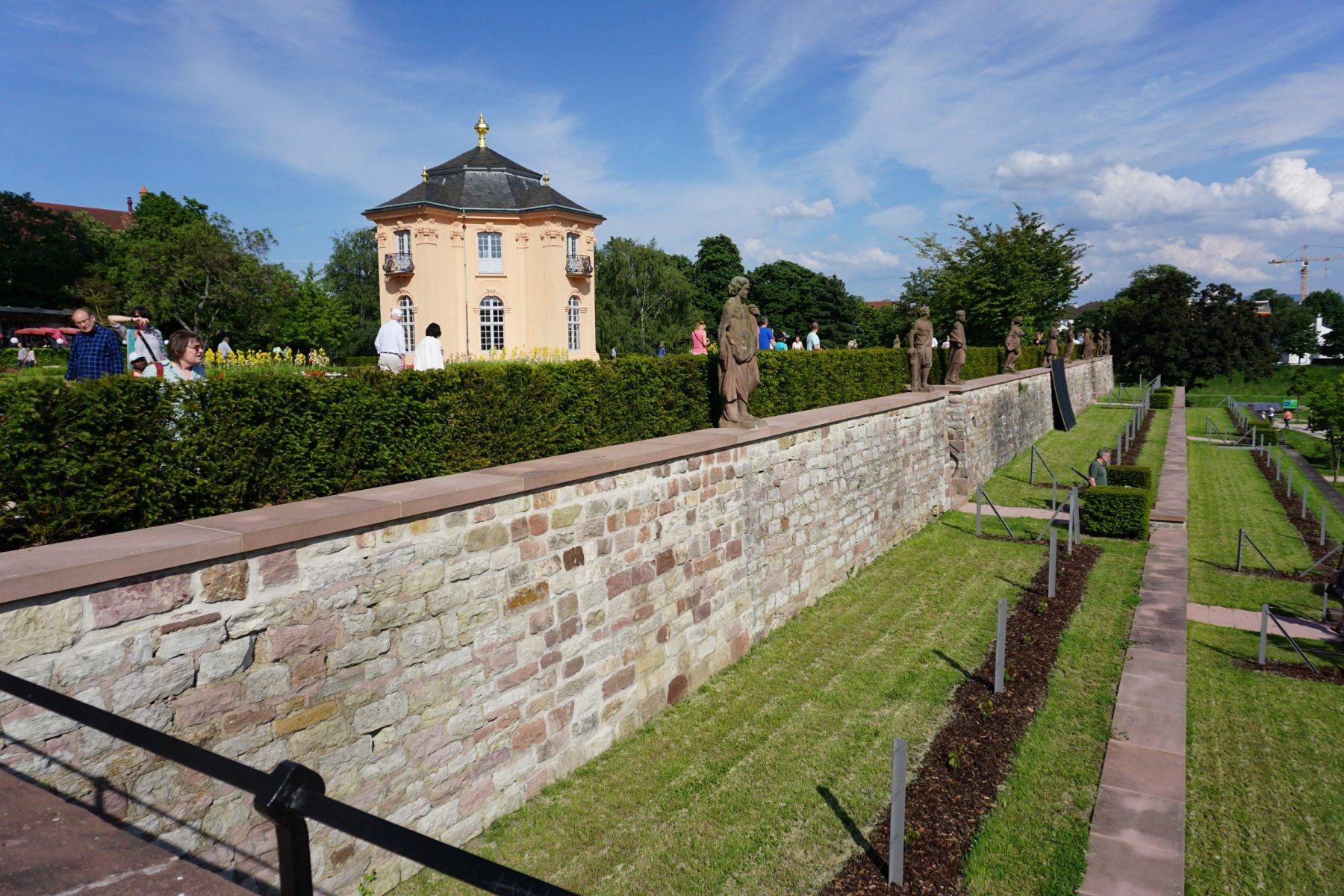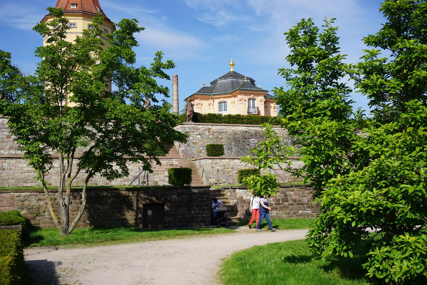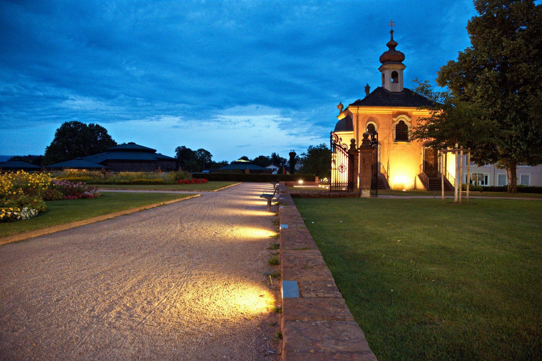 Das barocke axiale Wegkreuz und der historische Brunnen im Süden wurde erhalten. Im Norden ist an die Stelle des alten Brunnens eine neue Wassergießschale aus Sandstein getreten. Die Einsiedelner Kapelle wurde von dichtem Strauchwerk und Hecken befreit. Die umgebenden Terrassen aus Naturstein wurden von Efeu befreit und aufwendig saniert. Der Vorplatz des Wasserturms wurde als Zugang und Stellplatzanlage neu geordnet.