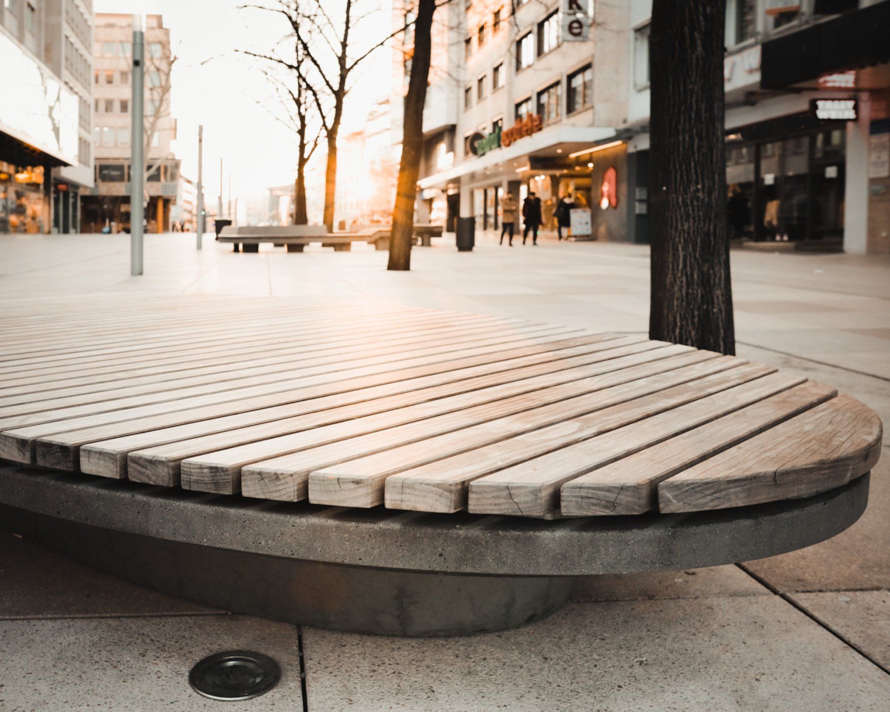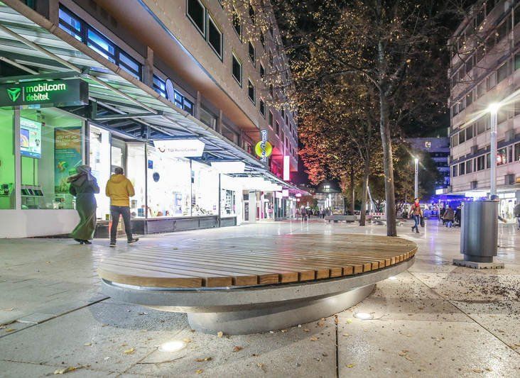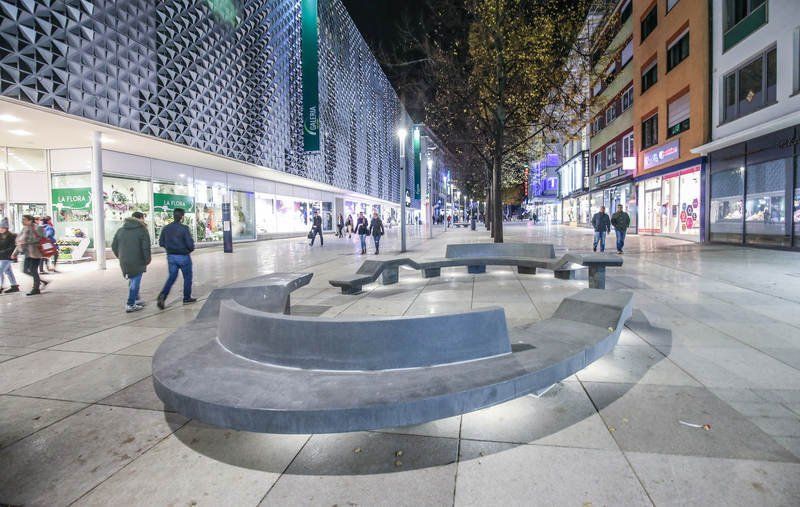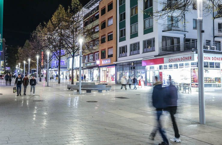 Die Fußgängerzone erhielt zwischen Marktplatz und Leopoldstraße ein zeitgemäßes neues Erscheinungsbild, ausgestattet mit moderner Technik für die Anforderungen an eine innerstädtische Promenade. Die über 30-jährigen Linden blieben erhalten. Der Fahrverkehr wurde auf Anlieferer beschränkt. Entlang der Geschäfte verlaufen beidseits großzügige Bewegungszonen. Unter den Bäumen entstand eine ruhige, breite Aufenthaltszone für vielfältige Nutzungsoptionen. An den Gasseneinmündungen laden Sitzelemente mit einer außergewöhnlichen organischen Form aus hochwertigem selbstverdichtendem Beton und gehärteten, einheimischen Holzauflagen zum Verweilen ein. Realisiert in Kooperation mit Weber-Ingenieure GmbH Pforzheim und Düsseldorf.