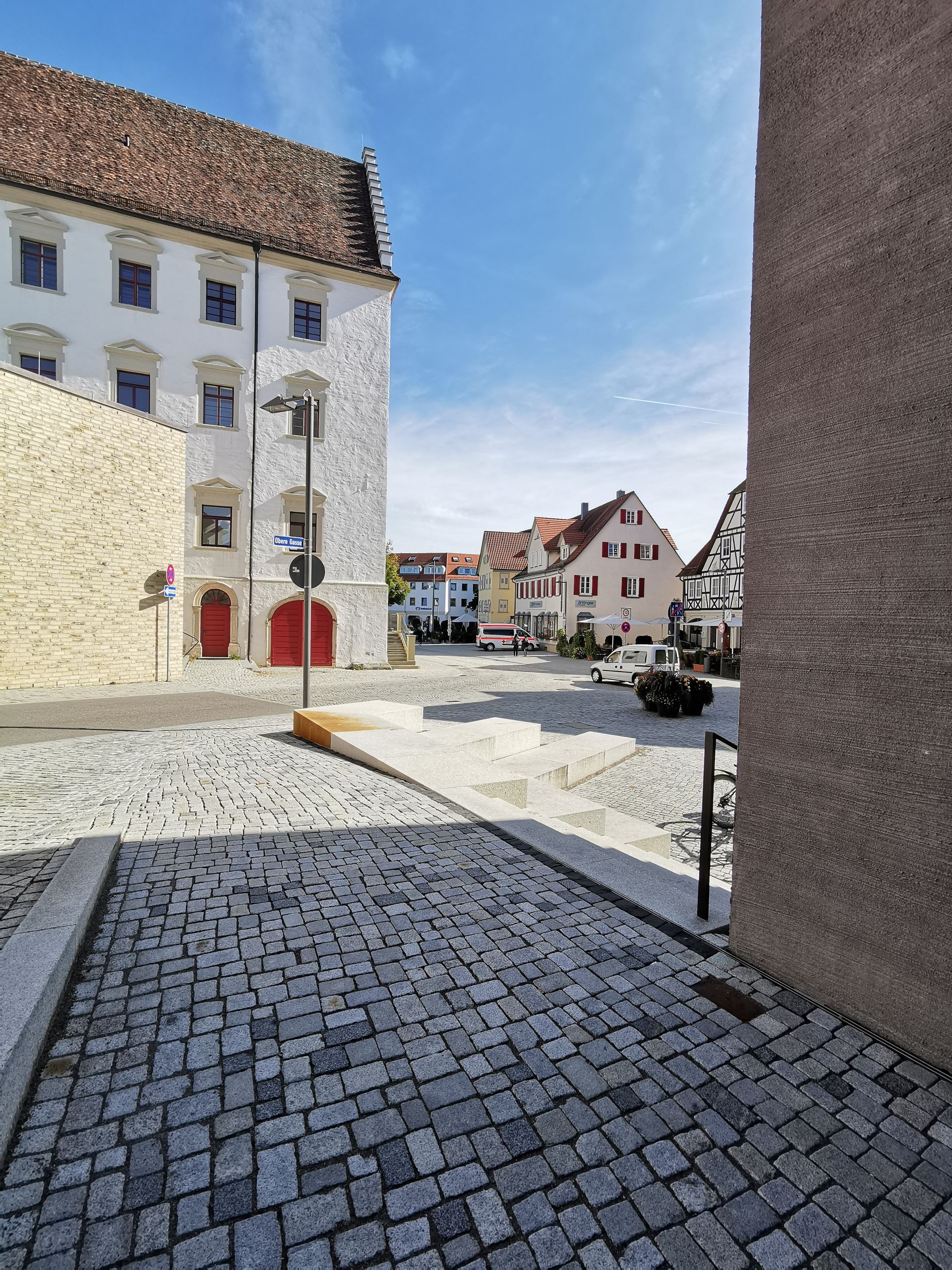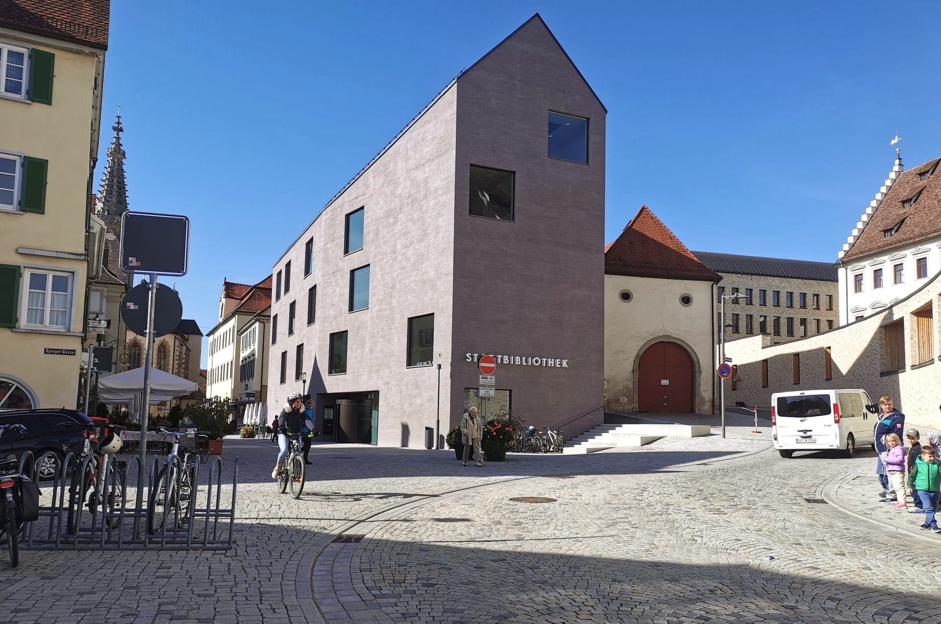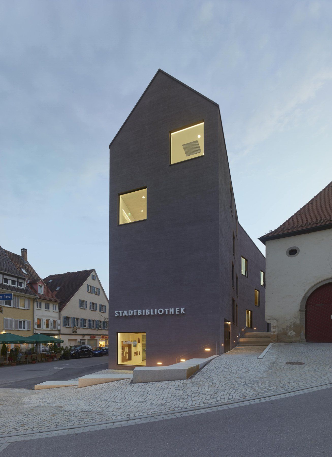 Der Neubau der Stadtbibliothek befindet sich unmittelbar im Zentrum der historischen Altstadt und bildet den Eckpunkt einer Straßenkreuzung. Die Außenanlagen schaffen neue Gassen und Aufenthaltsbereiche und vermitteln zwischen der ca. 2m höher gelegenen Oberen Gasse zur Fußgängerzone auf der Königstraße. Über Stufen- und Treppenanlagen aus Granit werden die Ebenen miteinander verbunden. Mit Sitzstufen wird ein kleiner neuer Stadtplatz eingefasst, der den künftigen Abschluss zum Straßenraum bildet. Der barrierefreie Zugang und Umgang erfolgt über den Gehweg entlang der Hauptstraßen. Die hohe Aufenthaltsqualität zeigt sich auch in der Verwendung von gesägtem Granitpflaster und -platten.