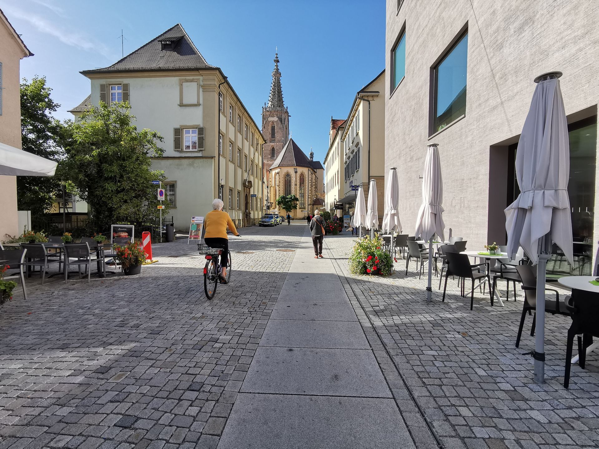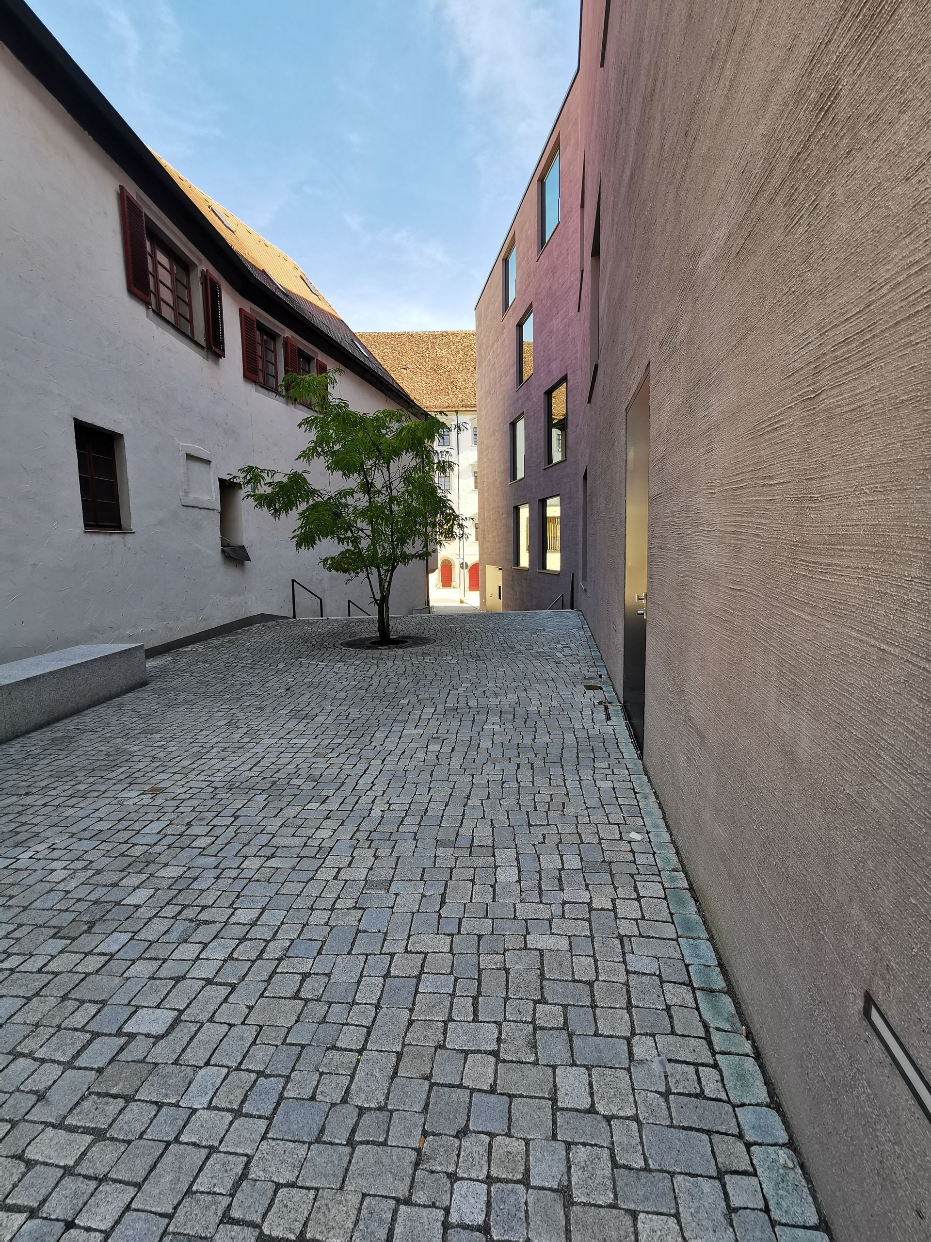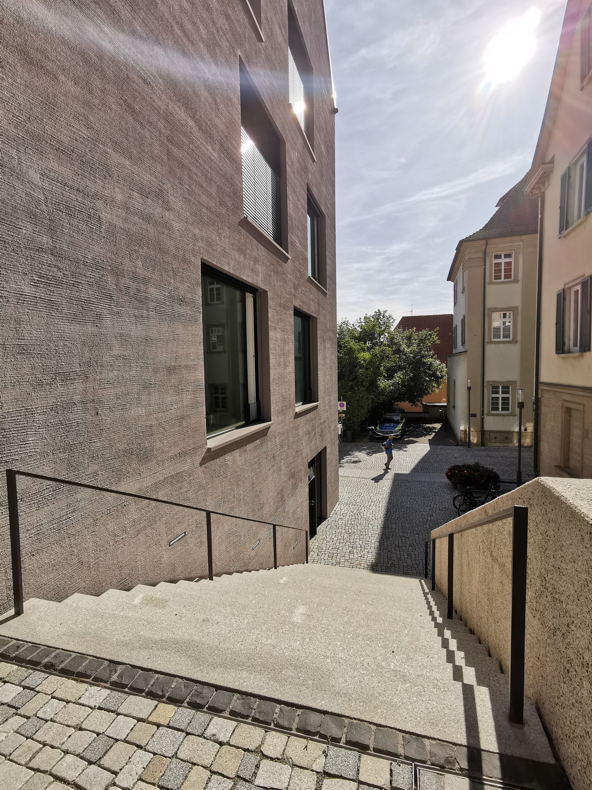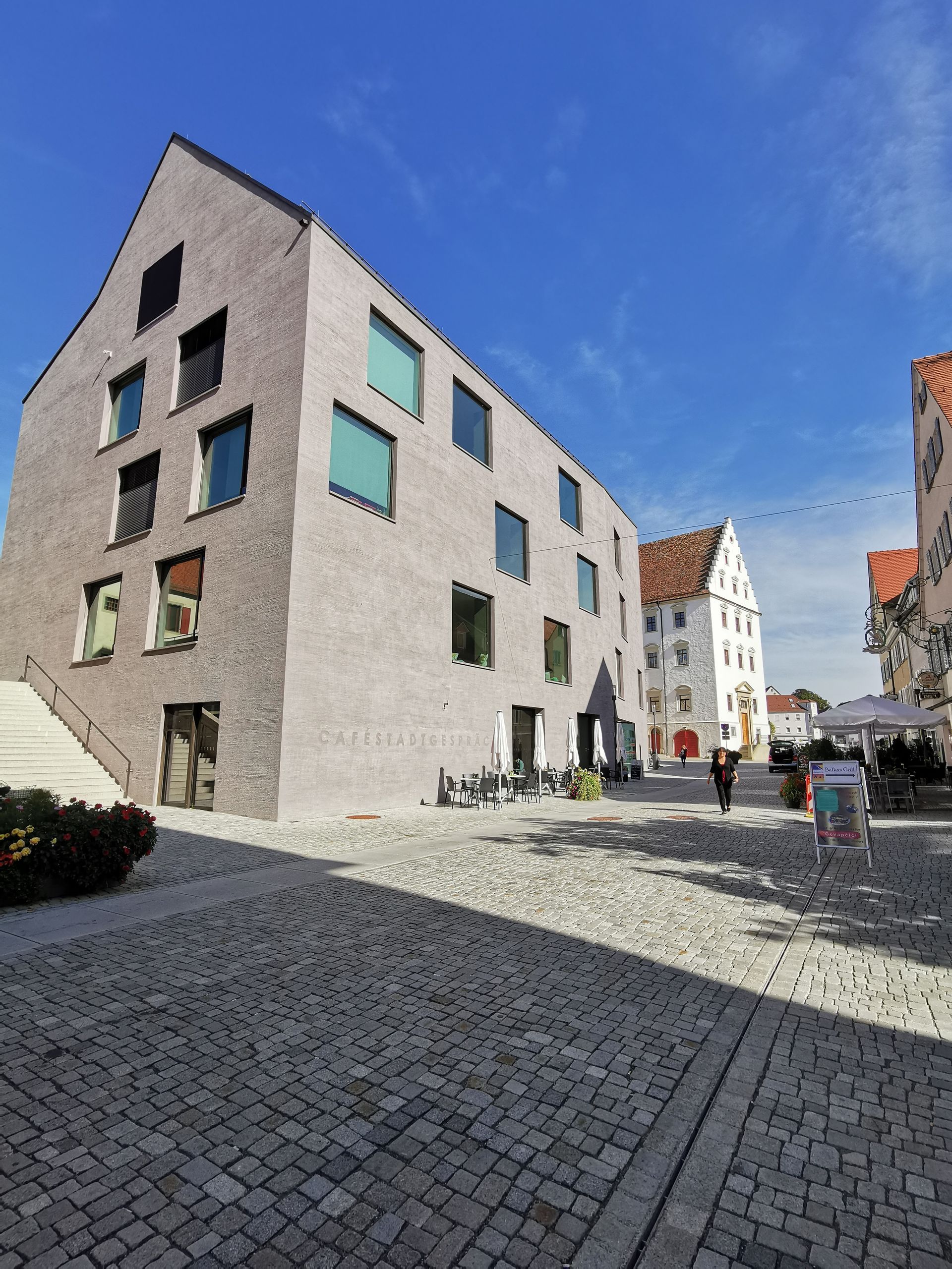 Der Neubau der Stadtbibliothek befindet sich unmittelbar im Zentrum der historischen Altstadt und bildet den Eckpunkt einer Straßenkreuzung. Die Außenanlagen schaffen neue Gassen und Aufenthaltsbereiche und vermitteln zwischen der ca. 2m höher gelegenen Oberen Gasse zur Fußgängerzone auf der Königstraße. Über Stufen- und Treppenanlagen aus Granit werden die Ebenen miteinander verbunden. Mit Sitzstufen wird ein kleiner neuer Stadtplatz eingefasst, der den künftigen Abschluss zum Straßenraum bildet. Der barrierefreie Zugang und Umgang erfolgt über den Gehweg entlang der Hauptstraßen. Die hohe Aufenthaltsqualität zeigt sich auch in der Verwendung von gesägtem Granitpflaster und -platten.