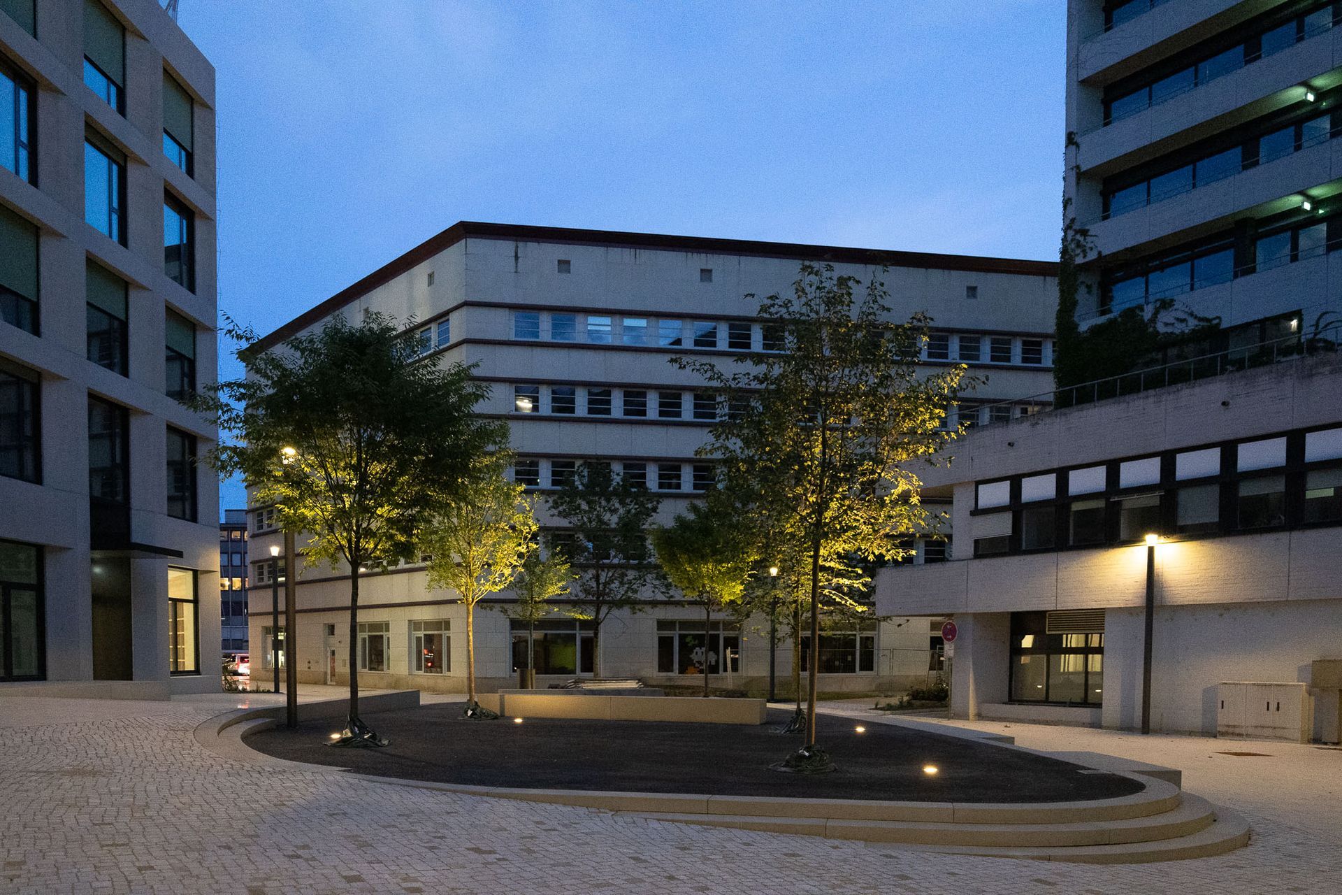 Die neue Mitte in Pforzheim vereint klare Strukturen mit lebendigen Elementen und schafft so einen Ort zum Verweilen und Begegnen. Bauminseln bringen Grün in den Stadtraum, spenden Schatten und tragen zu einem angenehmen Mikroklima bei. In der Abendstimmung setzen Bodenstrahler die Bäume in der Platzmitte eindrucksvoll in Szene und verleihen dem Raum eine besondere Atmosphäre. Betonfertigteile gliedern die Fläche und unterstreichen die präzise Gestaltung. Der Platzbelag aus hochwertigem Betonpflaster im Reihenverband sorgt für eine ruhige, klare Flächenwirkung, während das Natursteinpflaster aus Bayerwald-Granit in der Mitte einen markanten Akzent setzt. An den Seiten schaffen üppige Staudenbeete farbige Highlights im Wechsel der Jahreszeiten und runden das Bild zu einem lebendigen, einladenden Stadtraum ab.