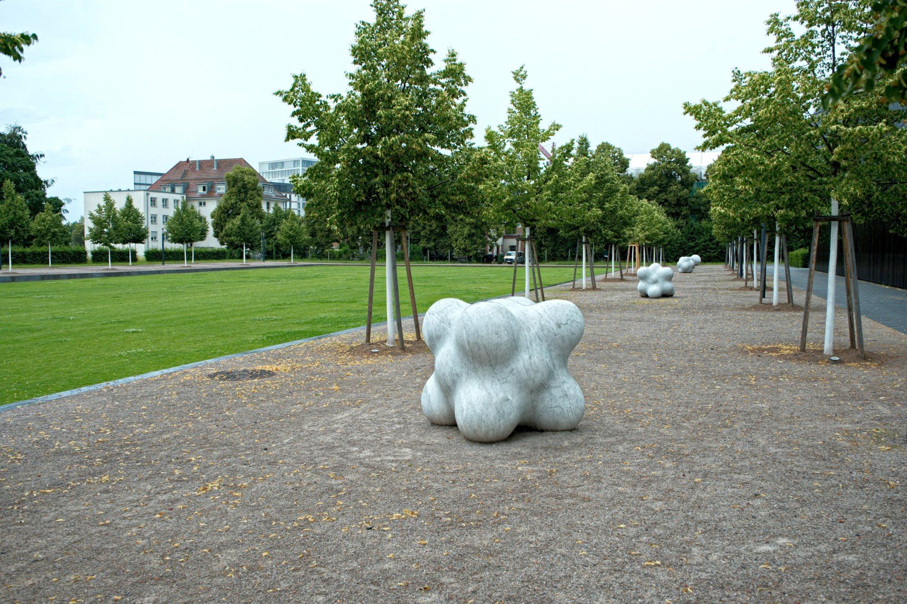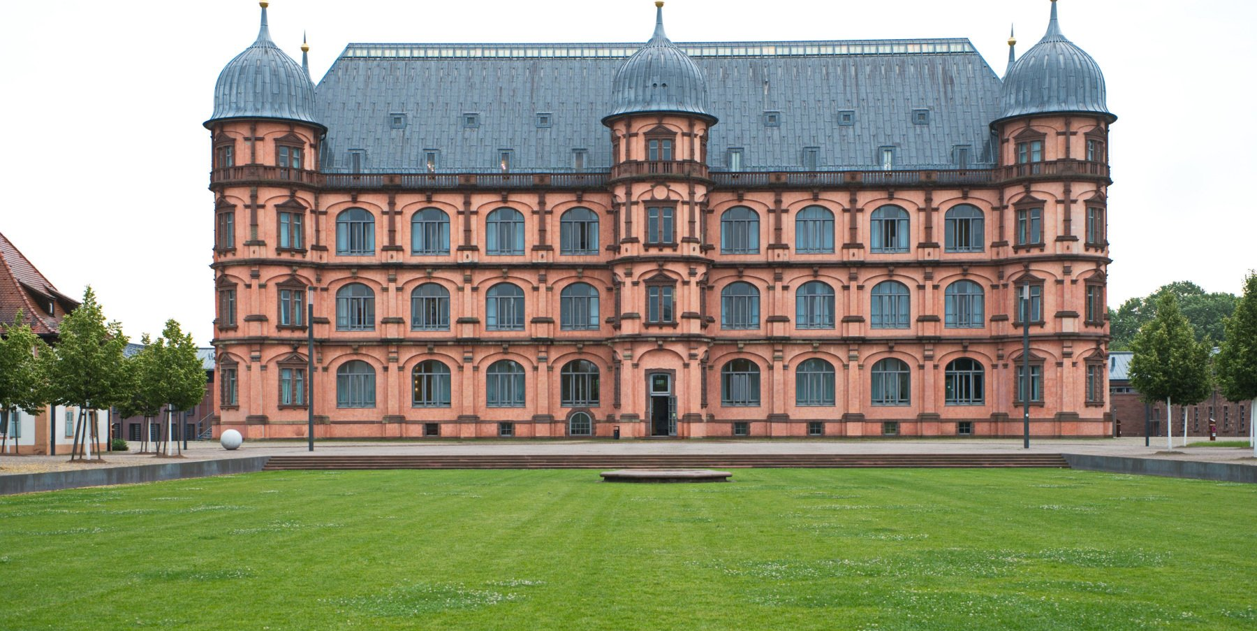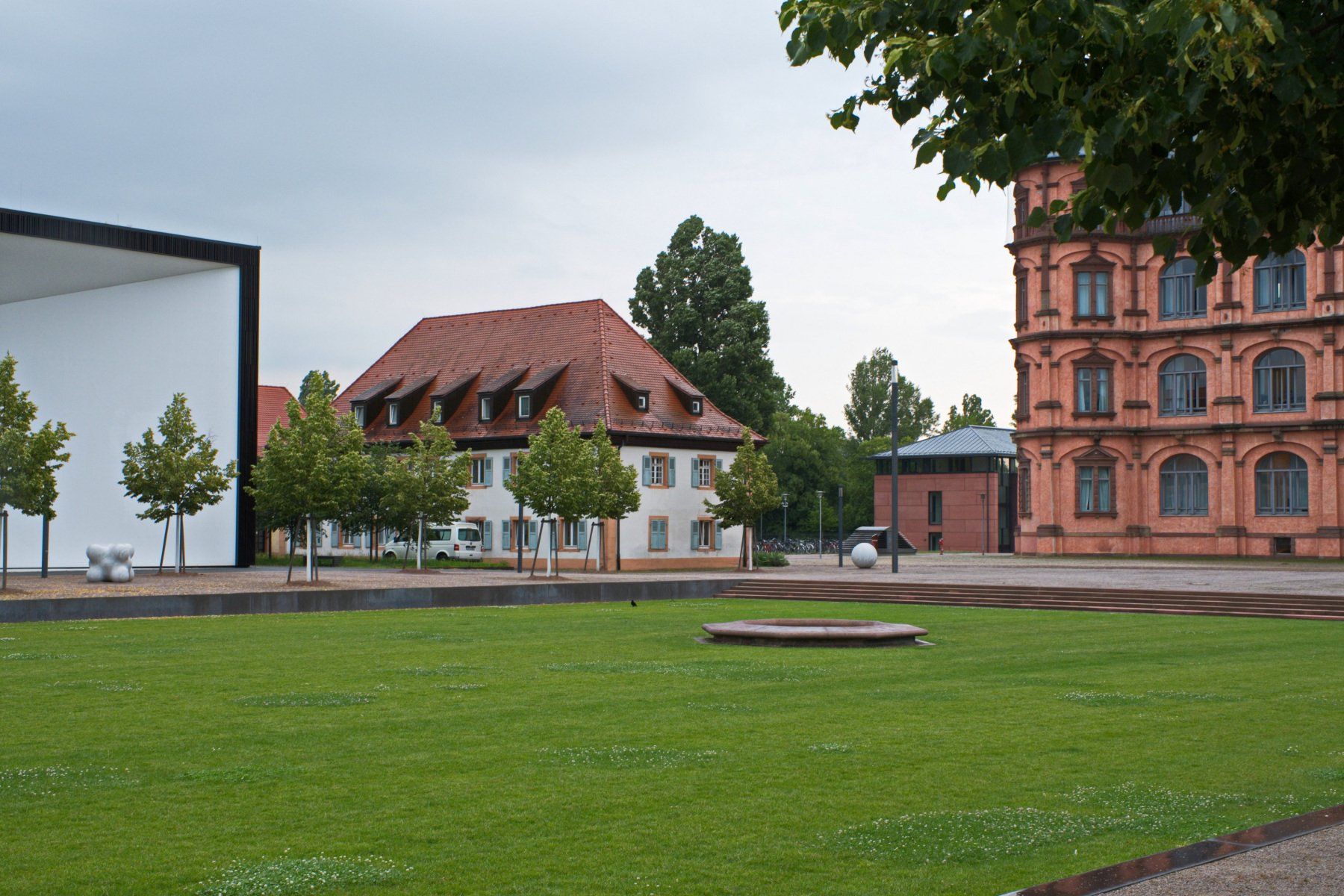 In Anlehnung an die geometrischen Strukturen der Gärten der Renaissance, entstanden repräsentative Freiflächen, die eine hohe Aufenthaltsqualität für alle Nutzer schaffen. Von der Innenstadt von Westen kommend wurde ein lang gestreckter „Rasenteppich“ vor dem Schloss ausgebreitet. Die leichte Absenkung des Rasenparterres um ca. 60 cm zum Schloss hin unterstützt die Raumöffnung vor dem Schloss. Die Längsseiten sind mit anthrazitfarbenen Sichtbeton-Sitzmauern gefasst, die östliche Stirnseite mit flachen Schreitstufen aus Sandstein begrenzt. Die Fläche oberhalb der Sitzstufen kann vor dem Schloss als Bühne für Konzerte genutzt werden, während die Zuhörer auf dem Rasen Platz finden. Das Rasenparterre ist beidseitig und doppelreihig von Linden gefasst. Diese bilden den Übergang zu dem Multimedia-gebäude, dessen Fassade die heutige starke Raumkante bildet. Das neue Unterrichtsgebäude im Nordosten ist über einen Fußweg aus Betonsteinpflaster erschlossen. Der Höhenunterschied von EG Schloss zum tiefer liegenden Unterrichtsgebäude um ca. 1,30 m wurde mit einer Sandsteintreppe adäquat der Bestandstreppe im Südosten der Anlage überwunden. Die Treppenstufen sind gleichzeitig Sitzstufen zum Aufenthalt.