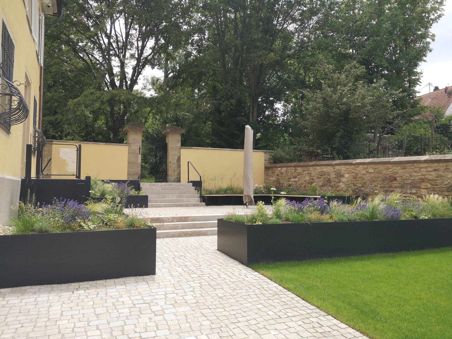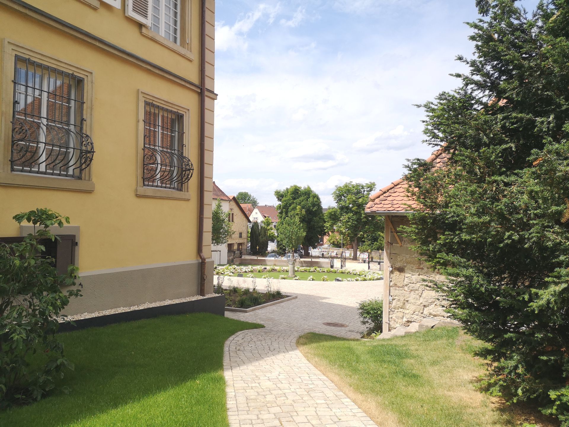 Das denkmalgeschützte Schlossensemble mit Schloss, Nebengebäuden und Parkanlage wurde in den letzten Jahren saniert und modernisiert. Die Freianlagenplanung geht behutsam mit dem Bestand um und interpretiert ihn neu. So greift die Planung in der Neugestaltung des Entrées die Form des ursprünglichen ovalen Parterres auf. Das Rosen-Rondel wird mit Hortensien neugestaltet und die wenig dauerhafte Kiesoberflächen durch Belagsflächen aus Dolomitklein-steinpflaster im Wilden Verband ersetzt. Um die herrschaftliche Einfahrt und den parkähnlichen Charakter zu unterstützen, wurde die resistente Rebona-Ulme als bestimmender Baum gewählt. Im waldähnlichen Teil des Schlossgartens wird der Gartenteich saniert und die Bepflanzung mit blühenden Sträuchern aufgewertet. Der ehemalige Küchengarten erfährt eine komplette Neugestaltung und wird sowohl den logistischen Anforderungen wie Anlieferung, Stellplatz, Müll und Aufstell-fläche Küchenzelt gerecht, als auch dem Bedarf nach einem intimen Aufenthaltsbereich für kurze Pausen oder Gespräche.