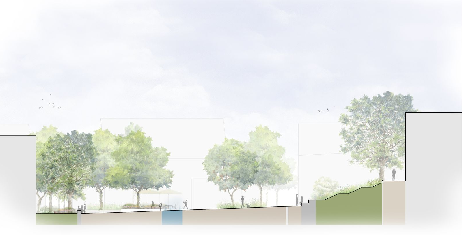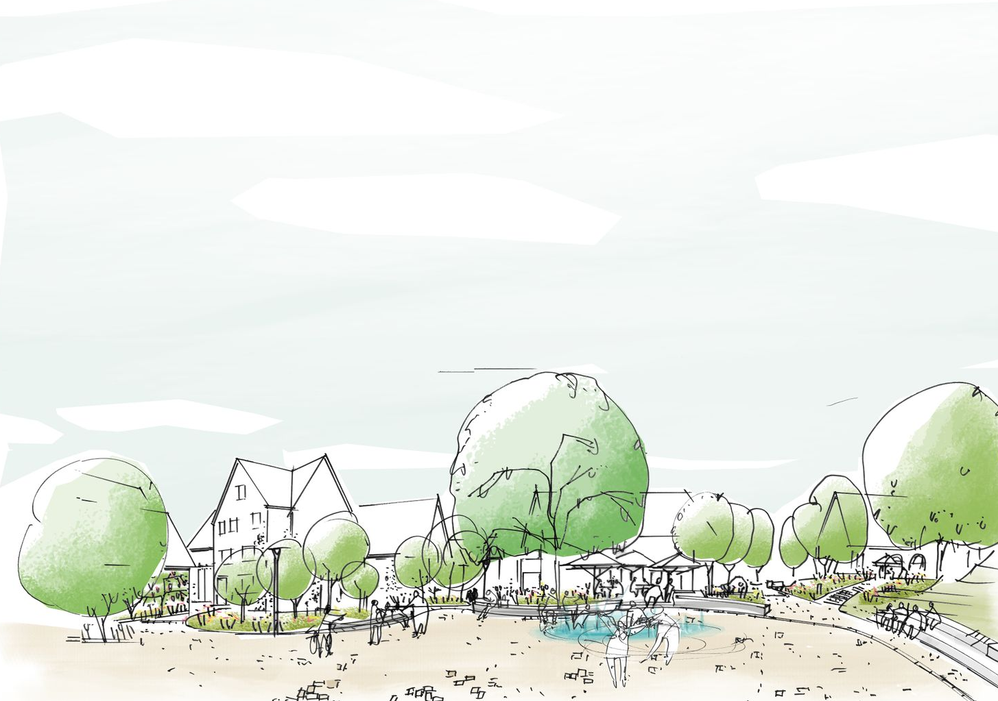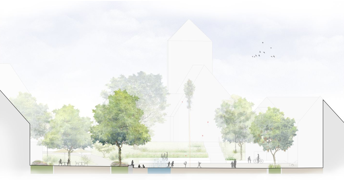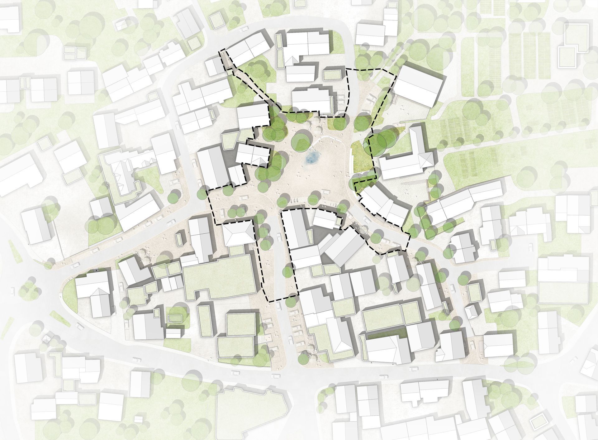 Der Entwurf entwickelt ein zusammenhängendes großzügiges Freiraumkonzept für eine neue belebte Ortsmitte und schafft durch den einheitlichen Stadtboden eine ruhige Atmosphäre. Die historischen Bestandsgebäude – die Agapituskirche, die Zehntscheune und das Rathaus – stehen in besonderer Beziehung und werden hervorgehoben. Besonders die Stufenanlage vor der Kirche holt diese an den Marktplatz heran und bietet tolle Aufenthaltsqualität für den Marktplatz. Durch einzelne, prägnante Gestaltungselemente wirkt der Platz belebt und es entsteht ein neuer Begegnungsraum. Die große offene Platzfläche kann flexibel für den Pfingst- oder Weihnachtsmarkt genutzt werden. Abgerundet wird das Konzept durch Verwendung von unterschiedlichen Stadtbäumen, wodurch eine Wechselwirkung aus sonnigen und schattigen Bereichen entsteht. Teil des Entwurfsgedankens ist so viele gesunde Bestandsbäume wie möglich zu erhalten. Durch offene bepflanzte Baumquartiere wird die Versiegelung der Fläche geringer ausfallen.