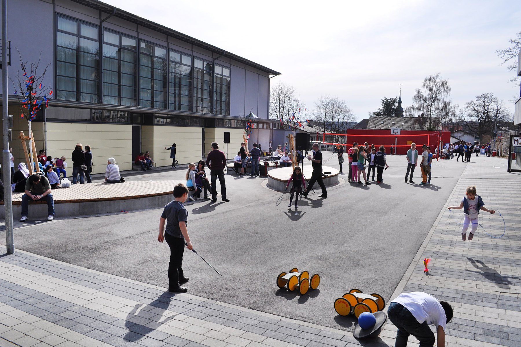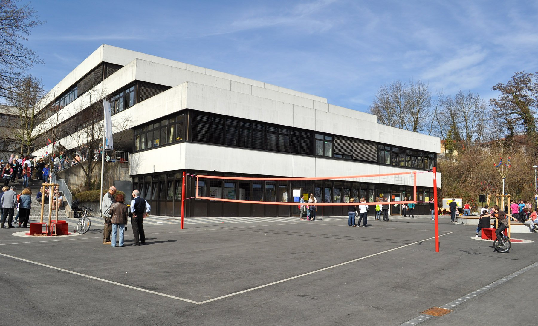 Um den Schülern eine möglichst große Fläche als Pausenraum anbieten zu können, wurde der neu gestaltete Pausenhof als Raum von „Gebäudewand zu Gebäudewand“ betrachtet. Es entstand eine Fläche, die größtenteils eben ist und somit einen großen Bewegungsraum ohne Hindernisse darstellt. Hierdurch ist auch eine problemlose Befahrbarkeit durch Rettungs- und Lieferfahrzeuge möglich. Lediglich in den Randbereichen erheben sich Holzpodeste aus dem Belag. Diese grenzen den Schulbereich vom Umfeld ab und dienen der multifunktionalen Nutzung, sowie als Rückzugszone. Um der Anforderung als Bewegungsraum gerecht zu werden, sind Sportflächen für Streetball, Volleyball sowie eine Fläche für Individualspiele entstanden.